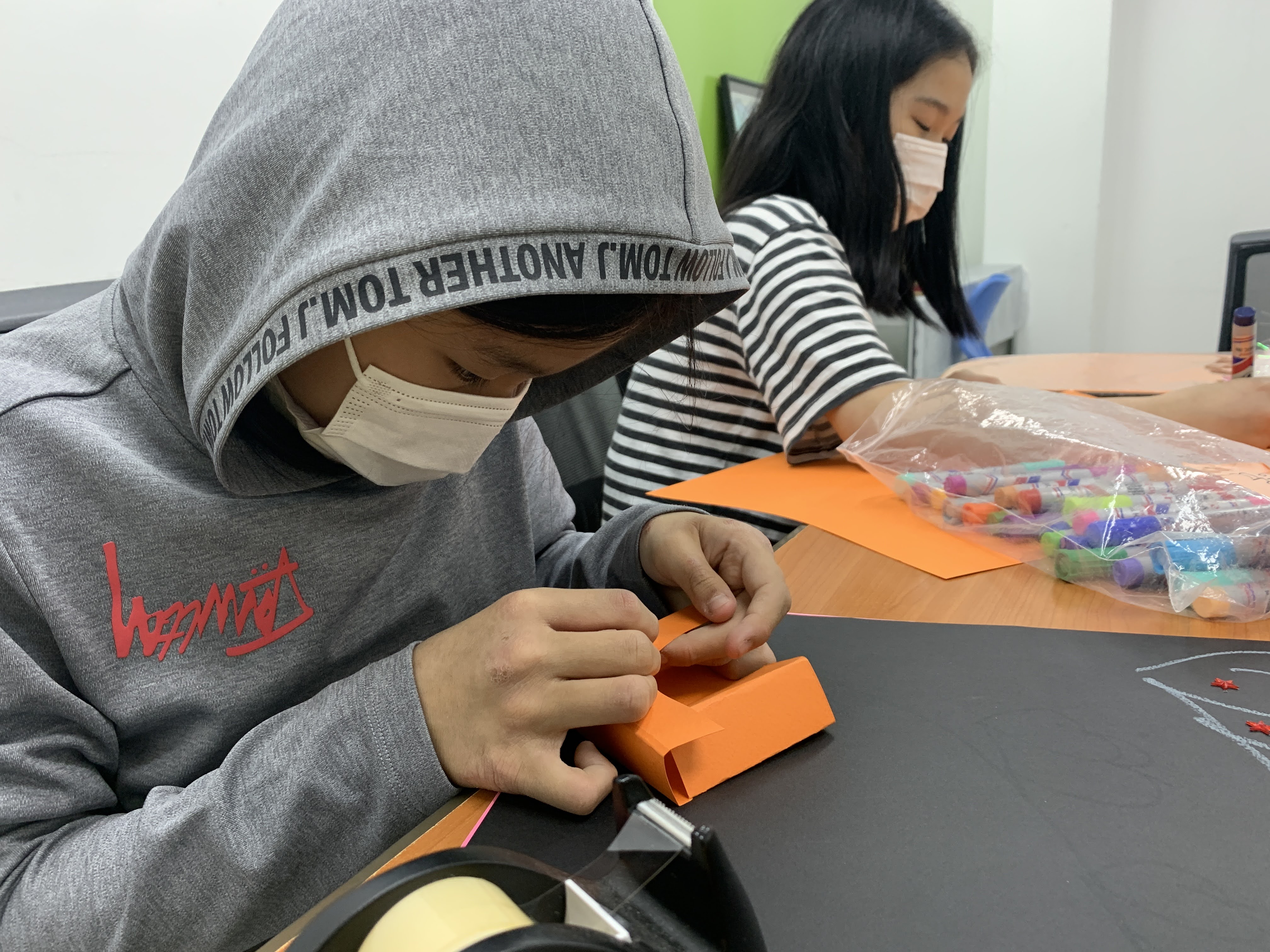 종이가 두꺼워 손이 아파오지만 괜찮다며 끝까지 해냅니다