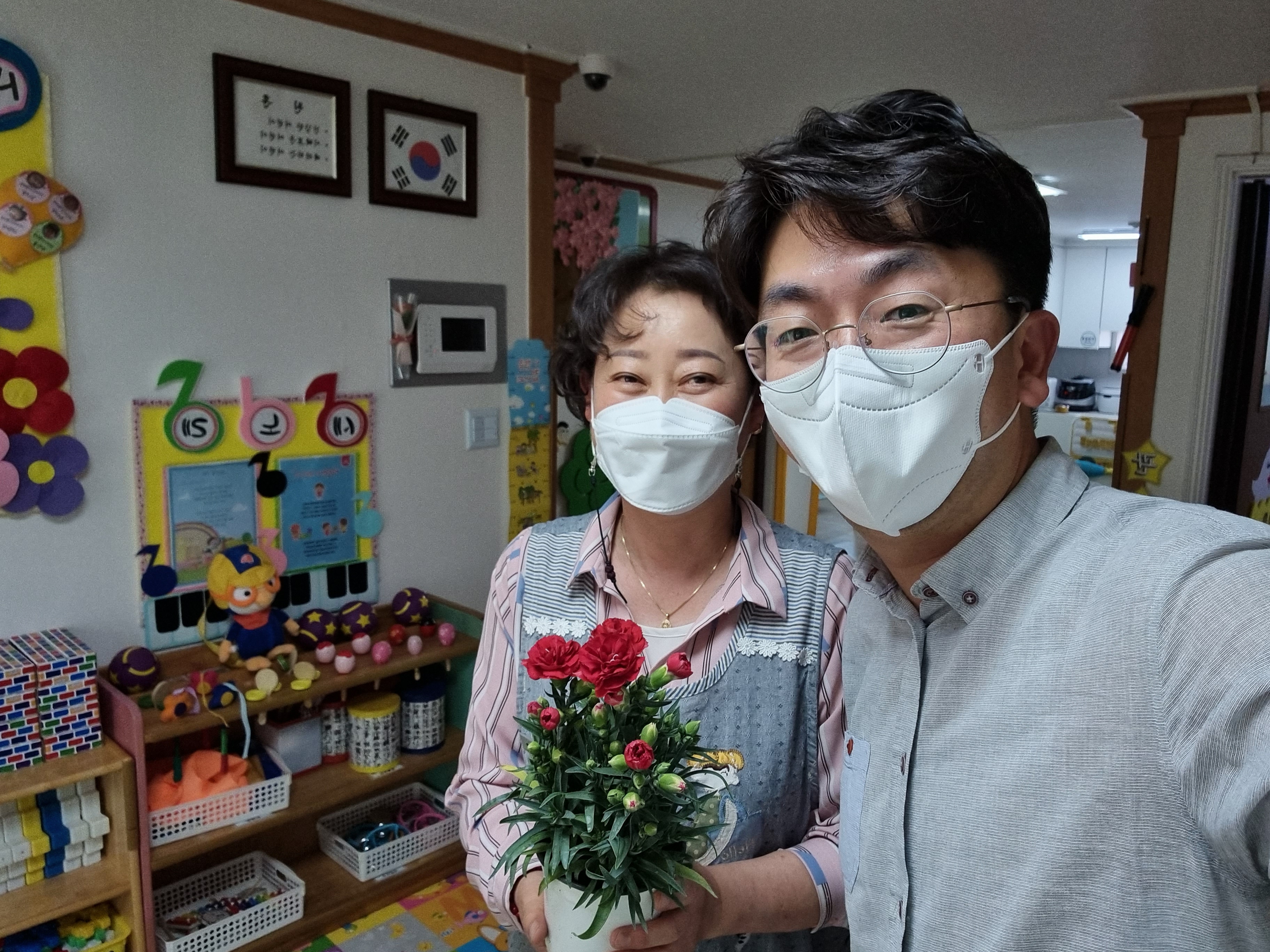 공항동 자연어린이집 원장님과 교사 분들에게 카네이션 화분을 선물했습니다.