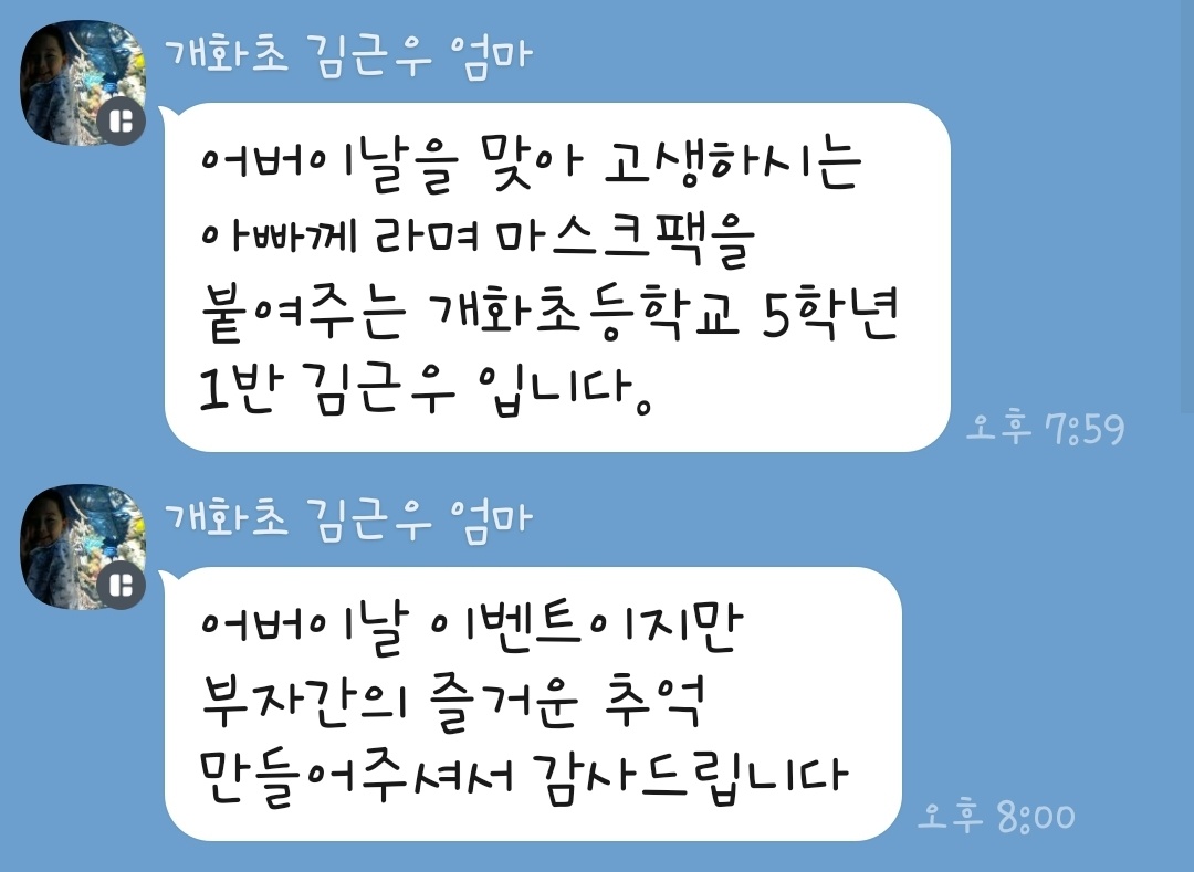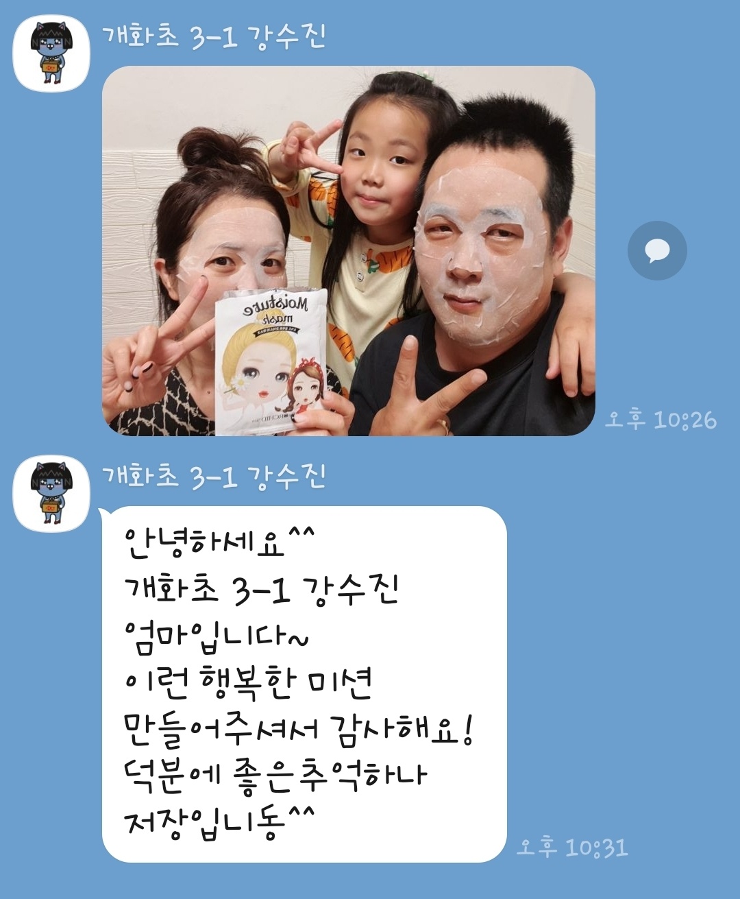 28. 김*우 : 어버이날을 맞아 고생하시는 아빠께라며 마스크팩을 붙여주는 개화초등학교 김근우입니다. 어버이날 이벤트이지만 부자간의 즐거운 추억 만들어주셔서 감사드립니다. 좋은 프로그램 만들어 주셔서 감사합니다.