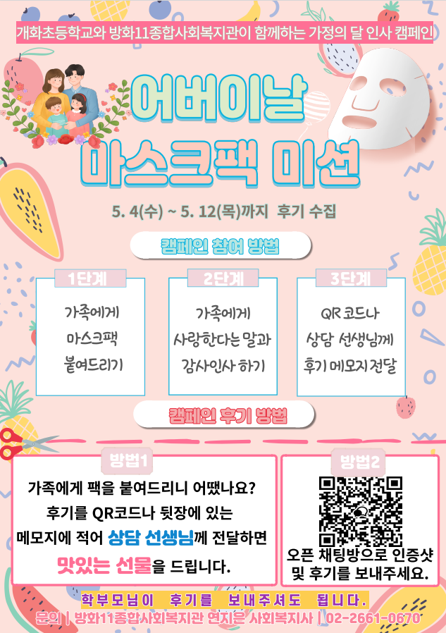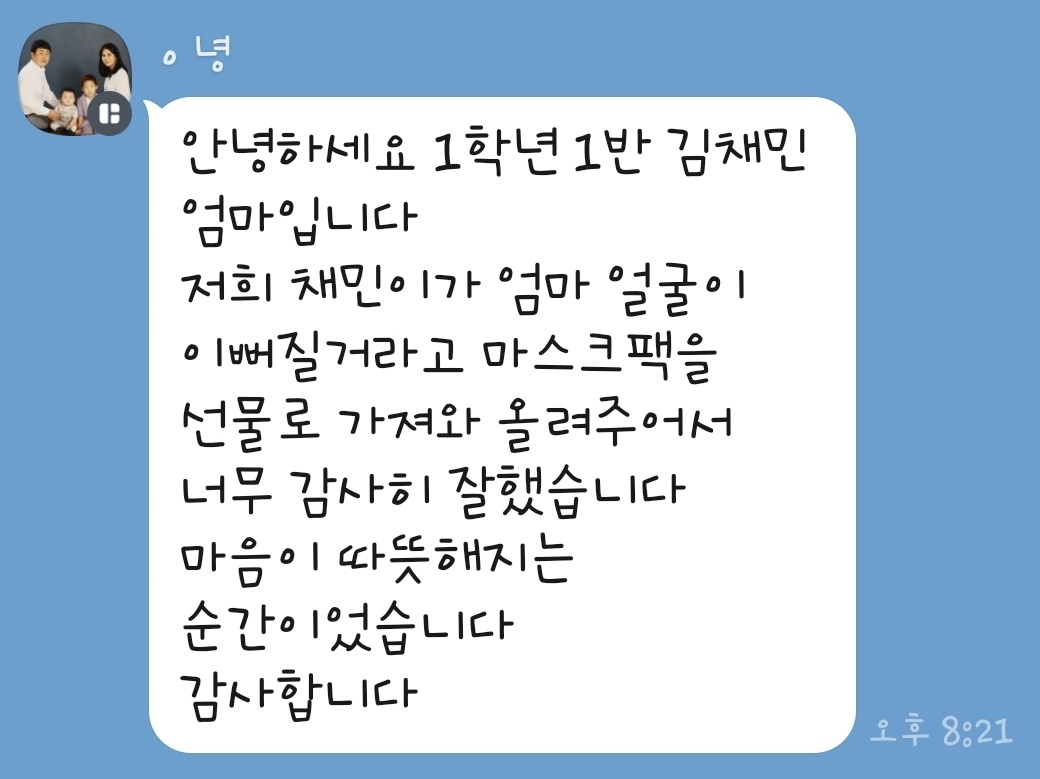 학생들이 마스크팩 인사캠페인을 구실로 일상생활에서 꾸준히 가족과 마음 나눔을 실천하기를 소망합니다.