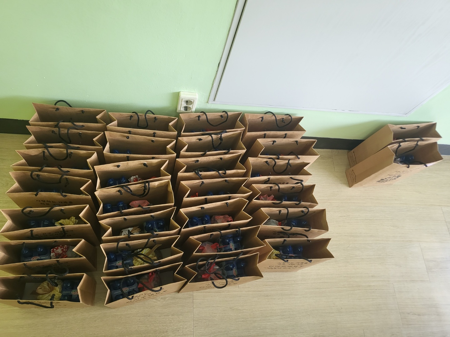 과자 꾸러미와 함께 후원품으로 들어온 음료수를 같이 쇼핑백에 담아 전달하기로 했습니다.