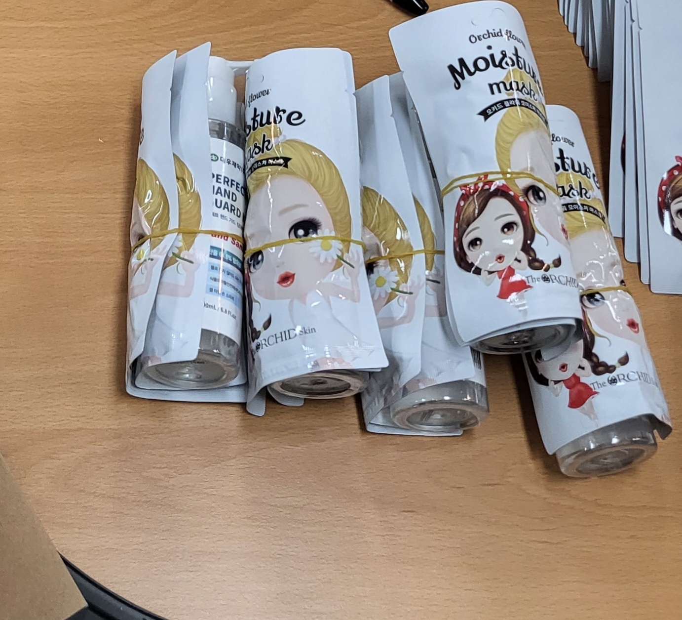 후원품으로 들어온 마스크팩과 손소독제를 활용한 키트를