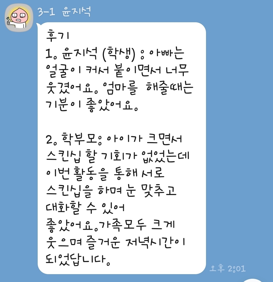 윤지석(모) : 아이가 크면서 스킨쉽 할 기회가 없었는데 이번 활동을 통해 서로 스킨쉽을 하며 눈 맞추고 대화할 수 있어 좋았어요. 가족 모두 크게 웃으며 즐거운 저녁 시간이 되었답니다.