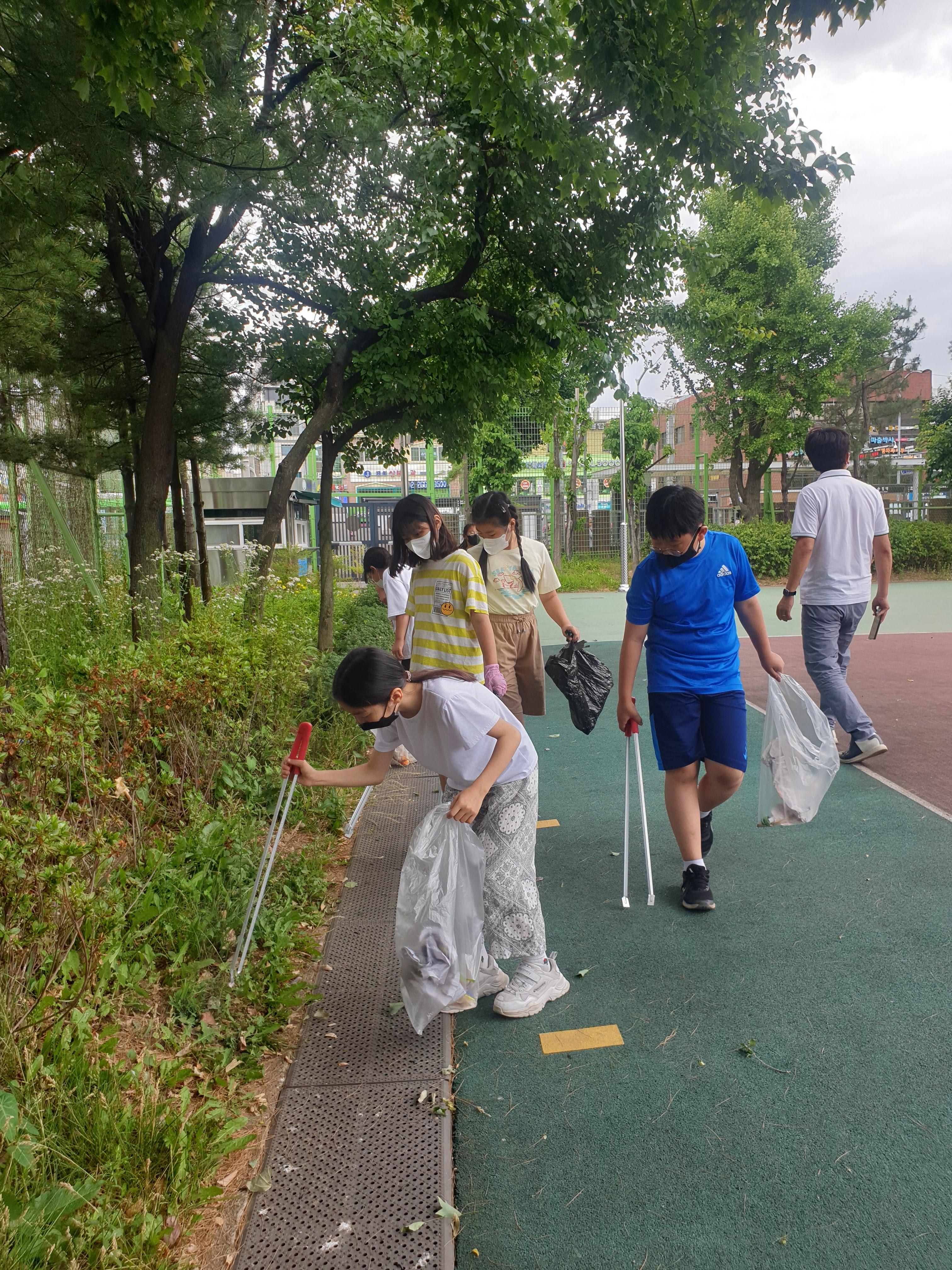 다음 날, 환경동아리 8명이 모였습니다. 아이들 열정이 대단합니다. 당장이라도 운동장에 뛰어나갈 기세입니다. 준비를 마치고 나섰습니다. 학교 구석구석을 다니며 쓰레기를 주웠습니다. 운동장에 있는 다른 아이들도 무얼 하는지 묻습니다. 환경동아리는 자랑스럽게 플로깅 활동이라고 소개했습니다.