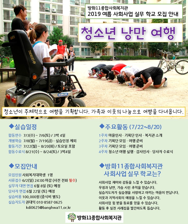 방화11종합사회복지관 2019 여름 사회사업 실무 학교 '떠나요! 청소년 낭만 여행' 실습생 모집