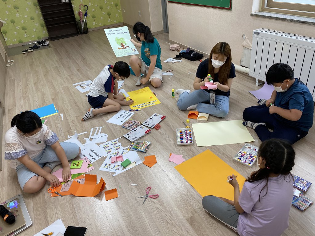 책자를 만들며 이야기꽃이 폈습니다. 그림을 색칠할 뿐인데 뭐가 그리 재밌는지 아이들이 웃습니다. 아이들의 웃음소리가 공간에 가득합니다. 웃음은 전염성이 강합니다. 아이들이 웃으니 저도 모르게 따라 웃게 됩니다. 이제 첫 모임에 돌았던 어색함은 찾아볼 수 없습니다.