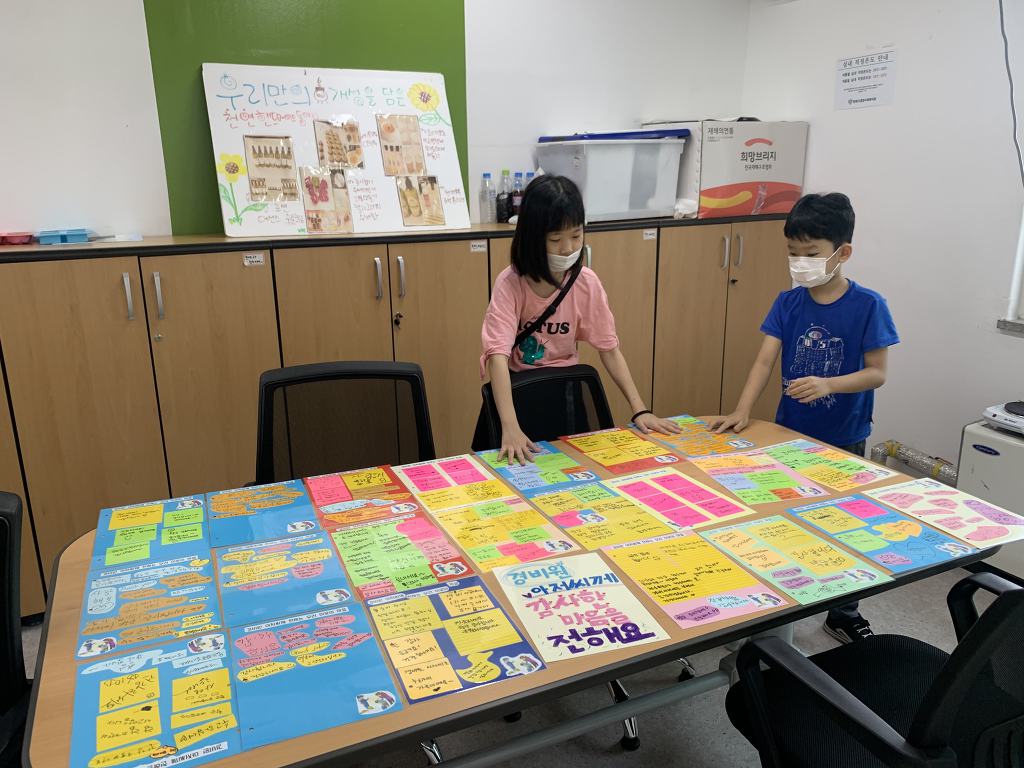 가정의달 생활복지운동 때 이웃에게 전하고 싶은 말을 붙임쪽지에 써서 붙인 아이들이 많았습니다. 이미 참여한 적이 있고 영상도 보니 무슨 활동을 해야 하는지 잘 알고 있었습니다.