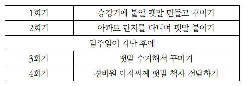 1,2회기는 승강기 안에 붙일 팻말을 만들고 자신이 사는 아파트 단지 승강기에 직접 붙입니다. 일주일 동안 주민들이 승강기에서 붙임쪽지에 경비원 아저씨께 전하는 편지를 써서 붙입니다. 3,4회기는 이 팻말을 수거해서 경비원 아저씨께 전달할 수 있도록 작은 책자를 만들어 직접 전달합니다.