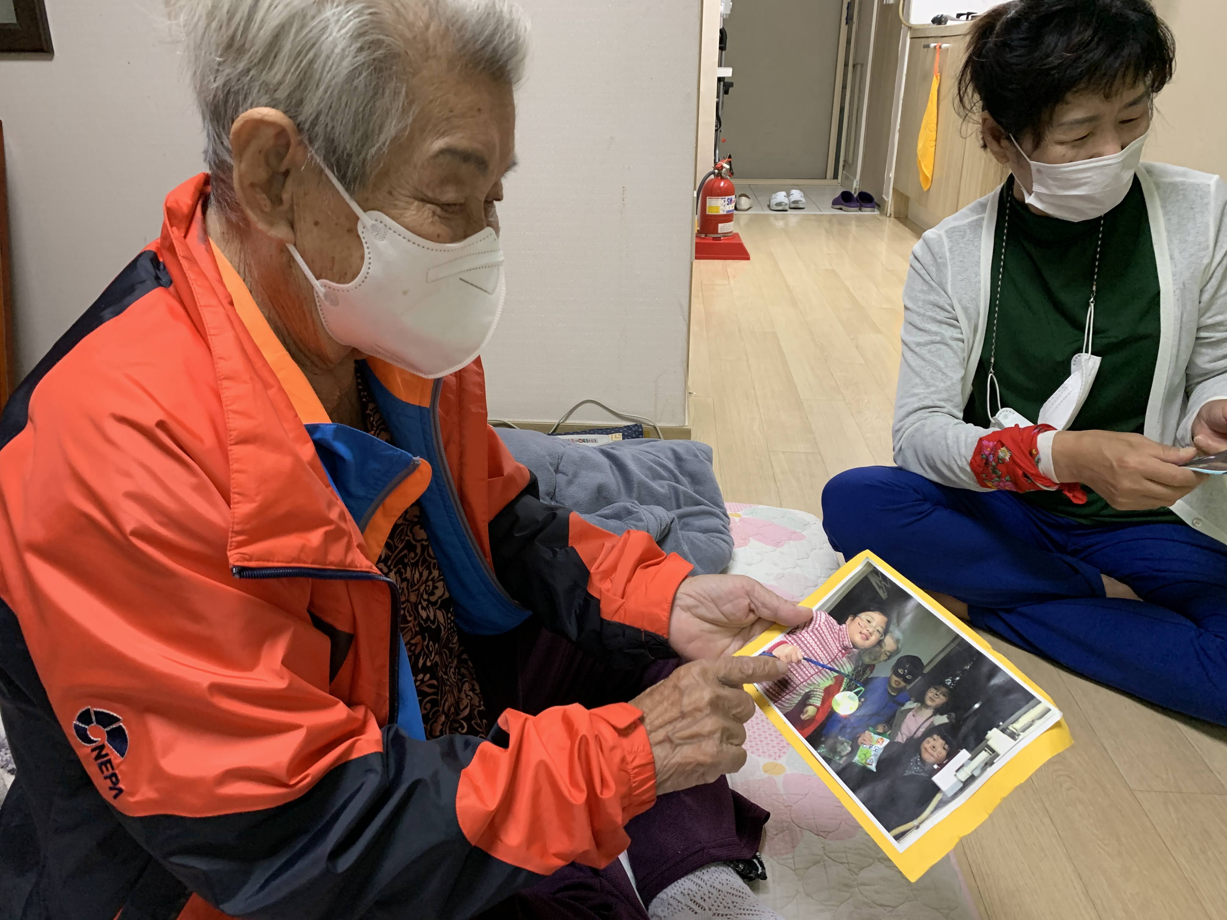 방 한편에 정우 사진을 꺼내 요양보호사 선생님께 정우를 자랑하십니다.