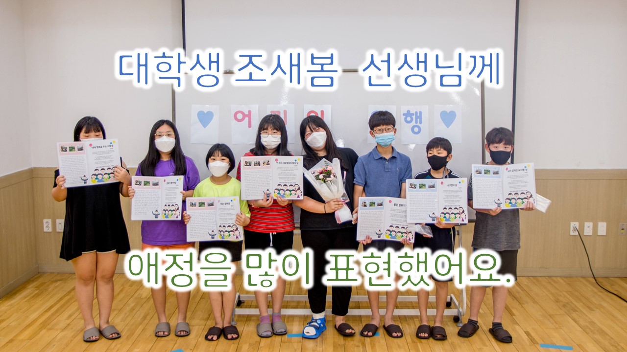 사실 그동안 코로나19로 인해 집에 갇혀있는 아이들과 그 아이들을 돌보는 보호자의 스트레스가 있었는데 대학생 선생님과 연락을 주고 받으며 다시 한번 내 아이의 소중함을 되돌아보는 시간이기도 했습니다. 늦은시간까지 아이들의 강점을 살피며 열과 성의를 다해주신 조새봄 선생님께 큰 박수와 감사의 마음을 전하고 싶습니다.