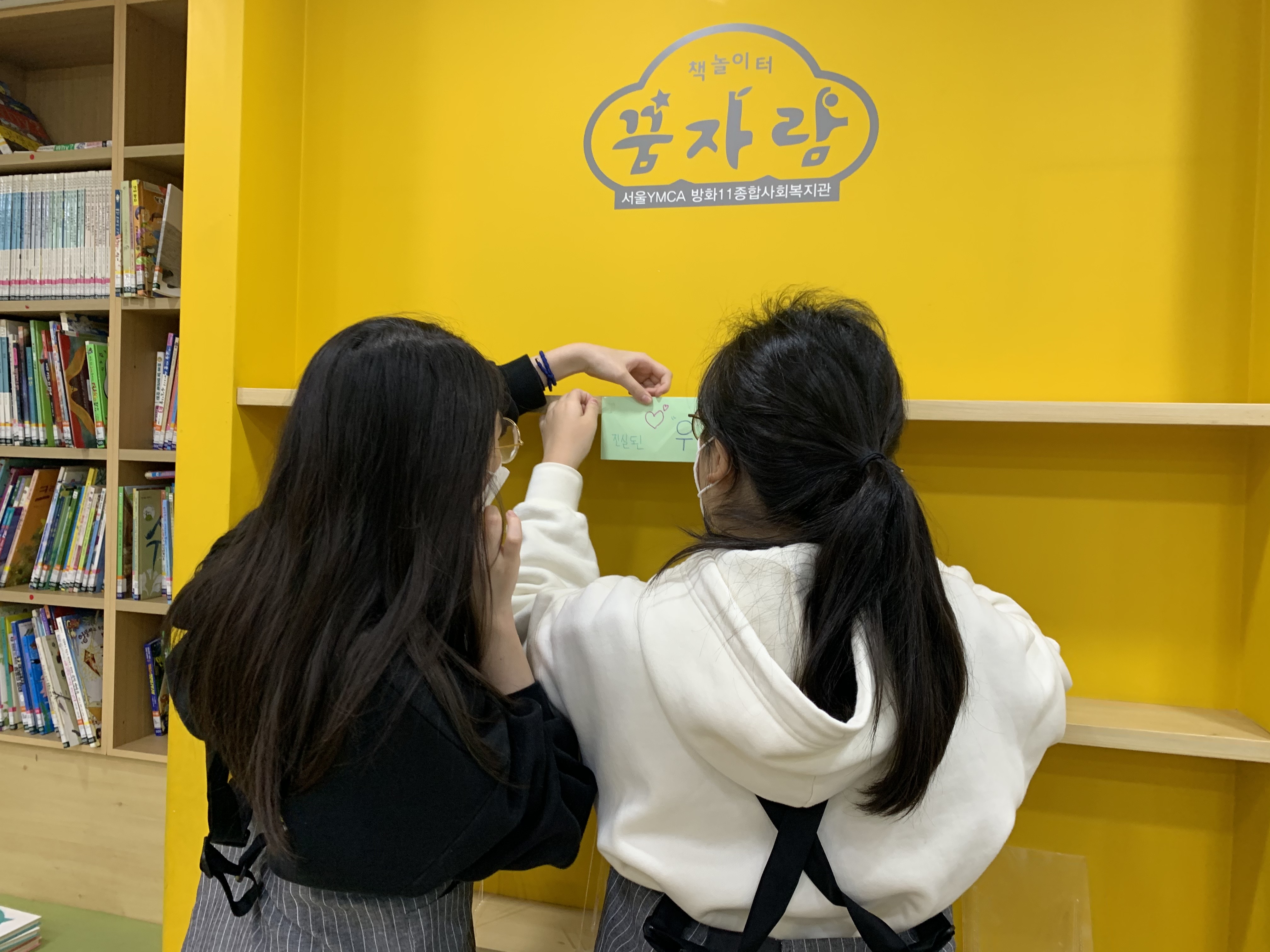 아이들에게 노란 서가 꾸미기를 부탁합니다.