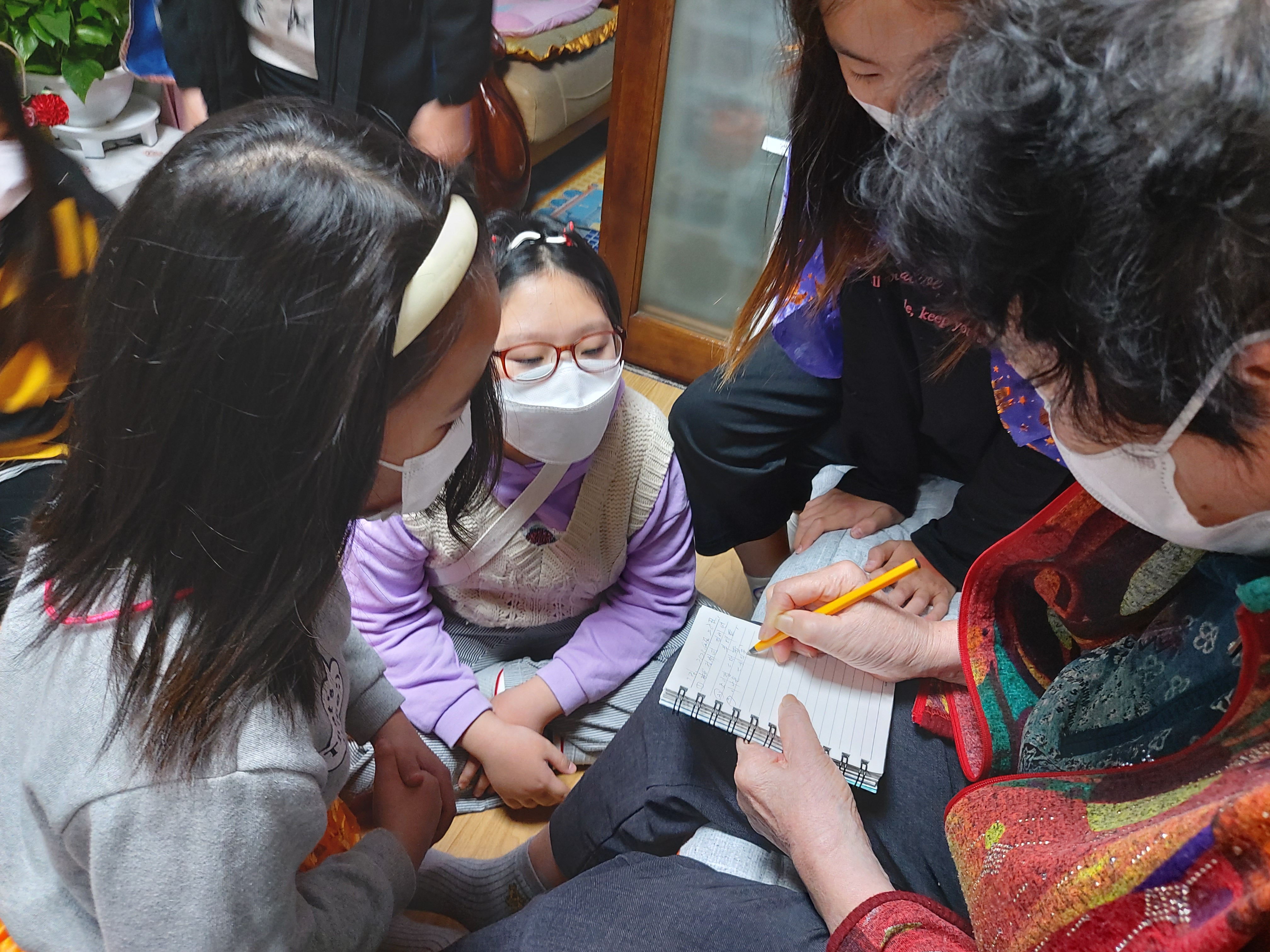 아이들이 할머니께서 수첩에 적으시는 것을 보고는