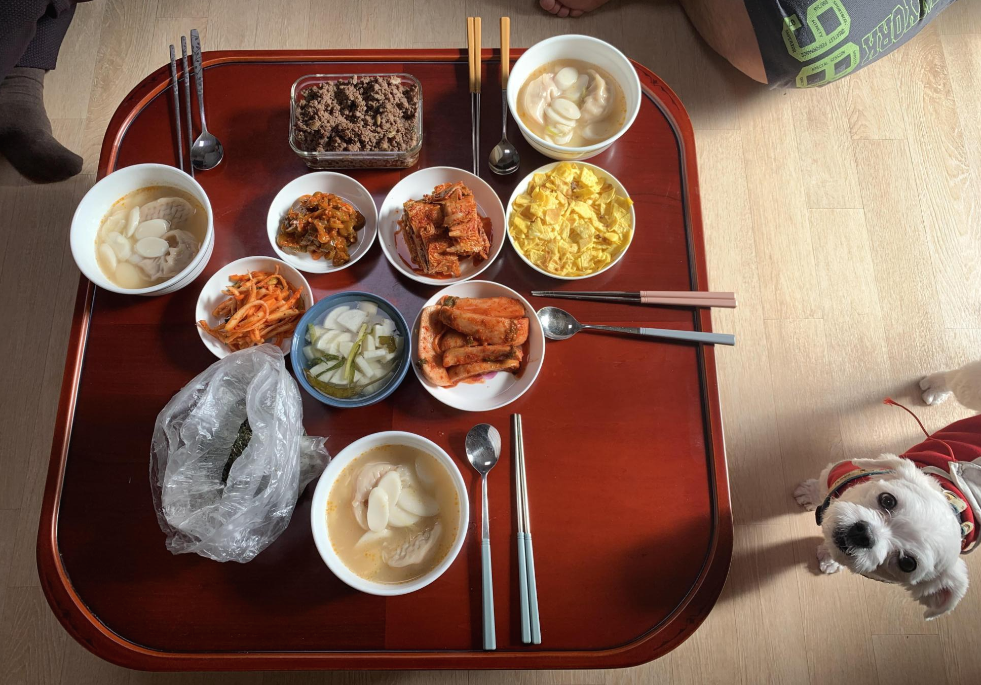 떡국 한 그릇에 반찬이 푸짐합니다.