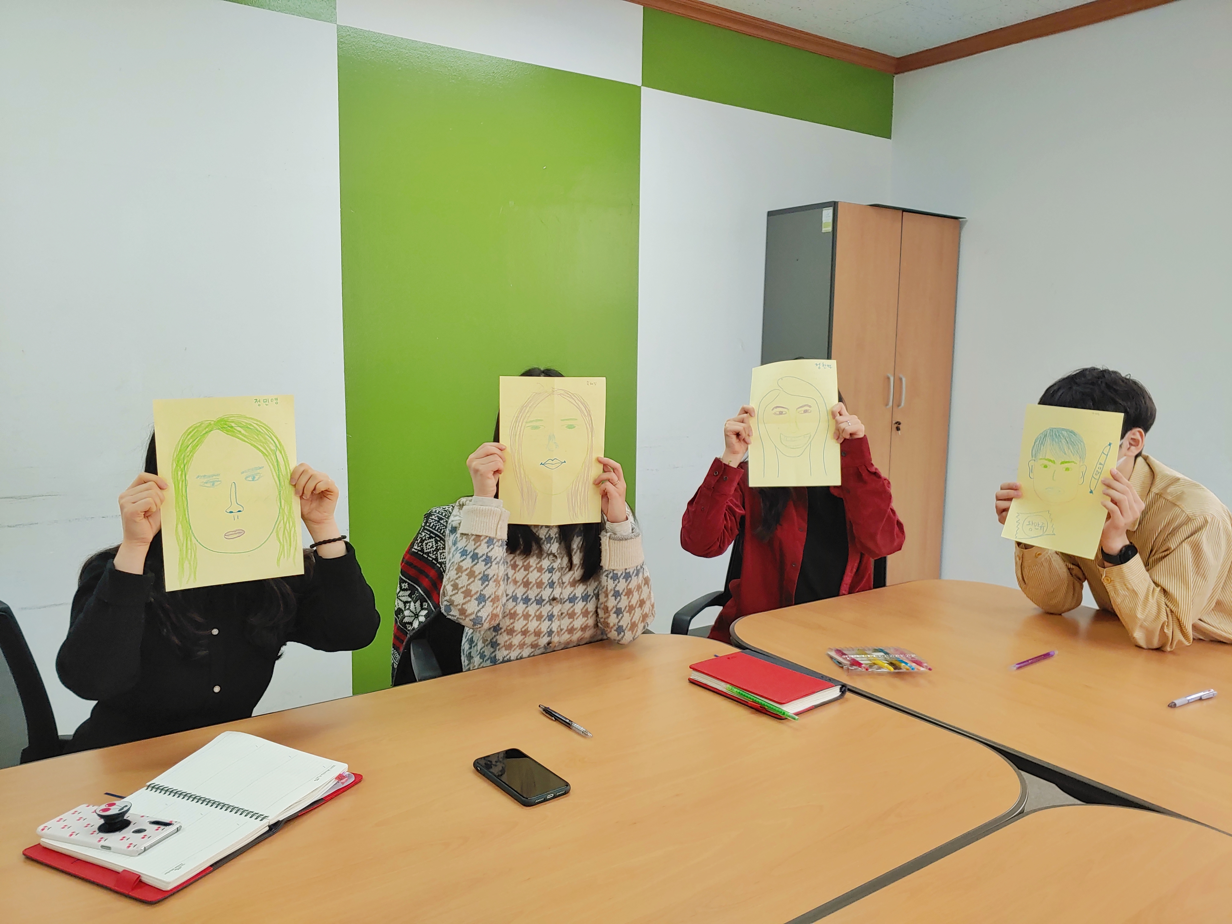 먼저 4명이 다른 1명의 얼굴을 조금씩 나누어서 그립니다.