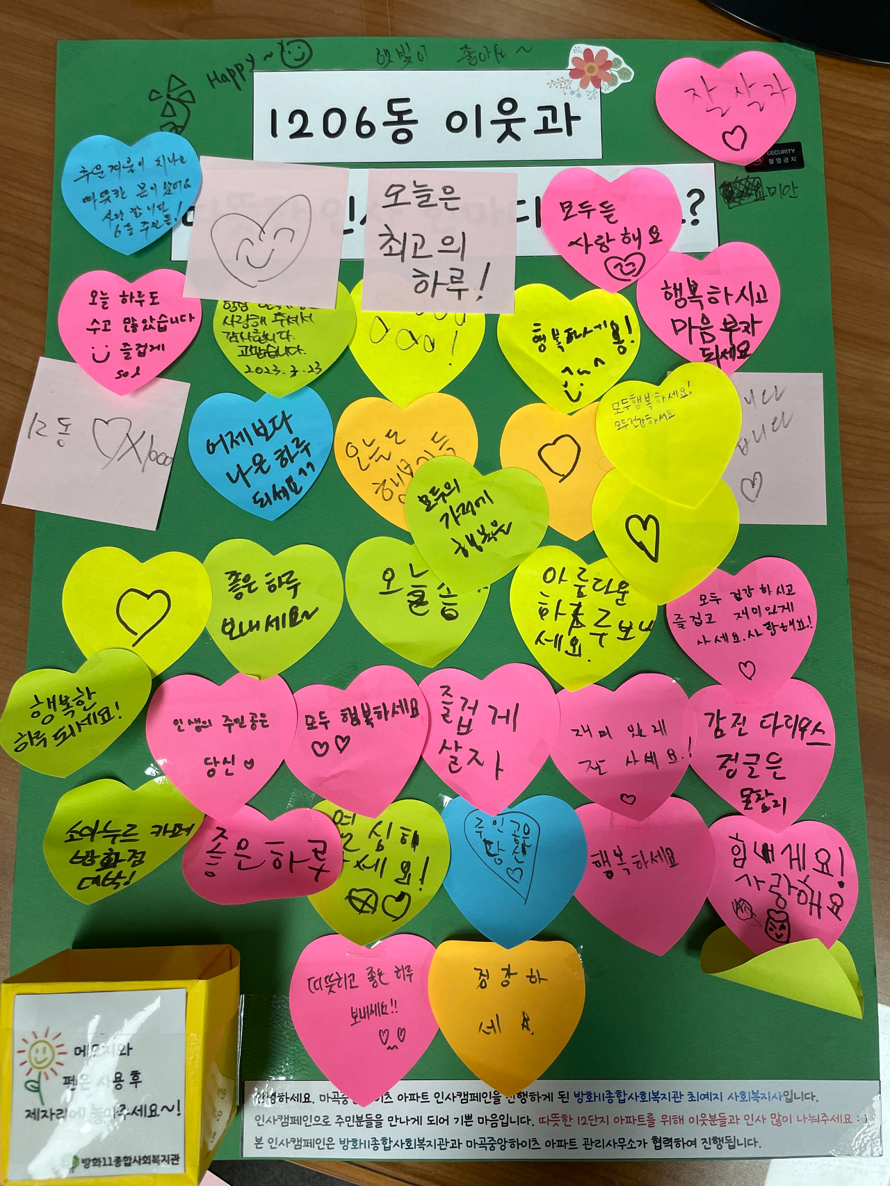- 주택(고시원)과 함께하는 인사캠페인 : 다양한 주제로 지역주민과 함께 가족, 친구, 이웃과 인사를 나누며 방화2동에 인사문화를 확산하는 사업, 4월~5월 진행