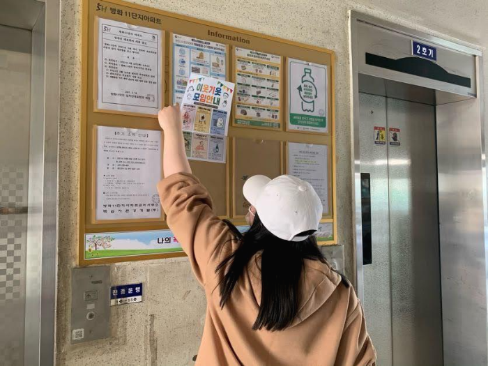 인사스티커를 승강기에 붙일 때 주민들과 대화도 나누었습니다.