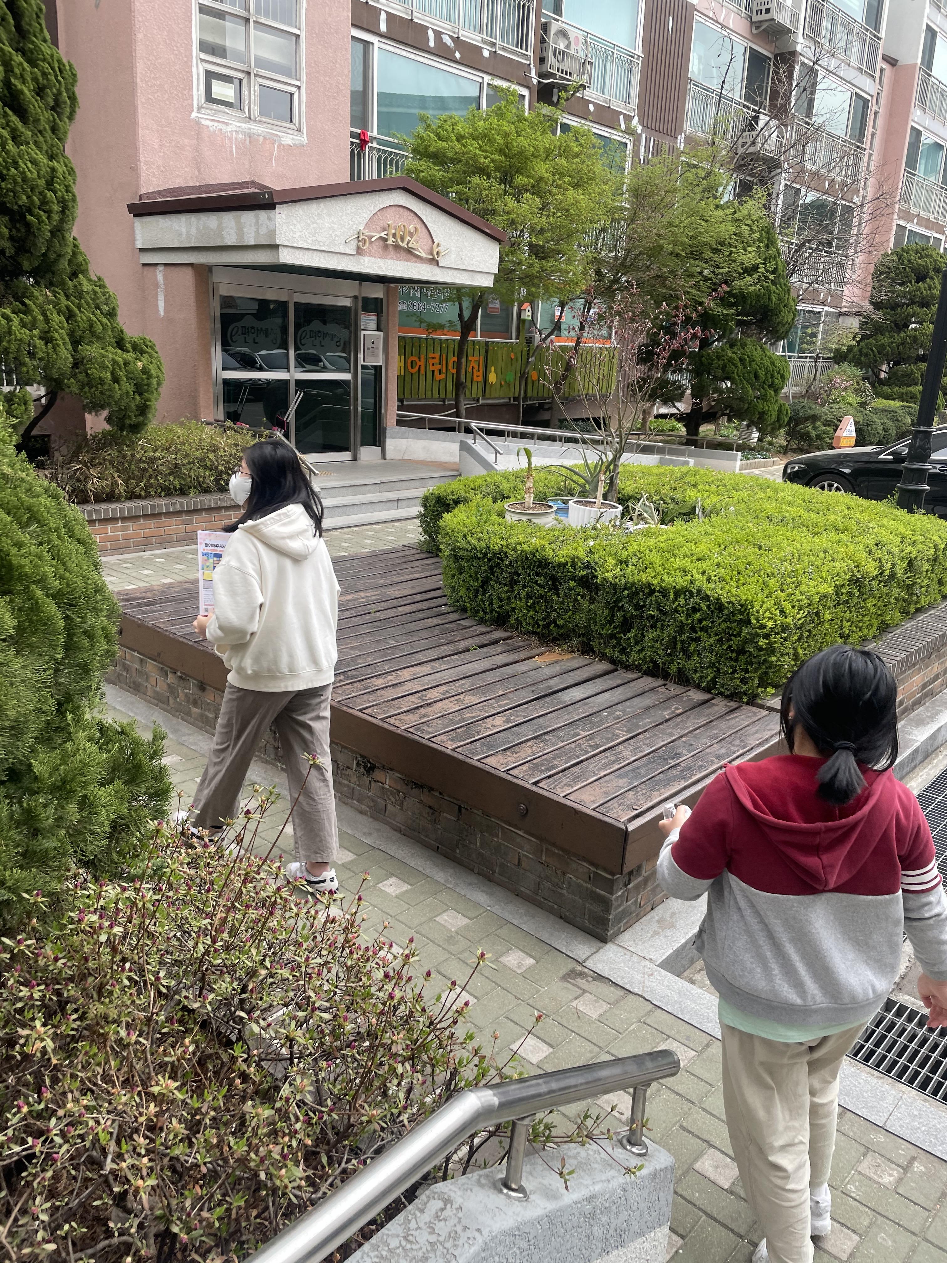 인사캠페인 후기안내문을 아파트에 부착하기 위해 이정이 정연이와 방화e편한세상 관리사무소에 방문했습니다.