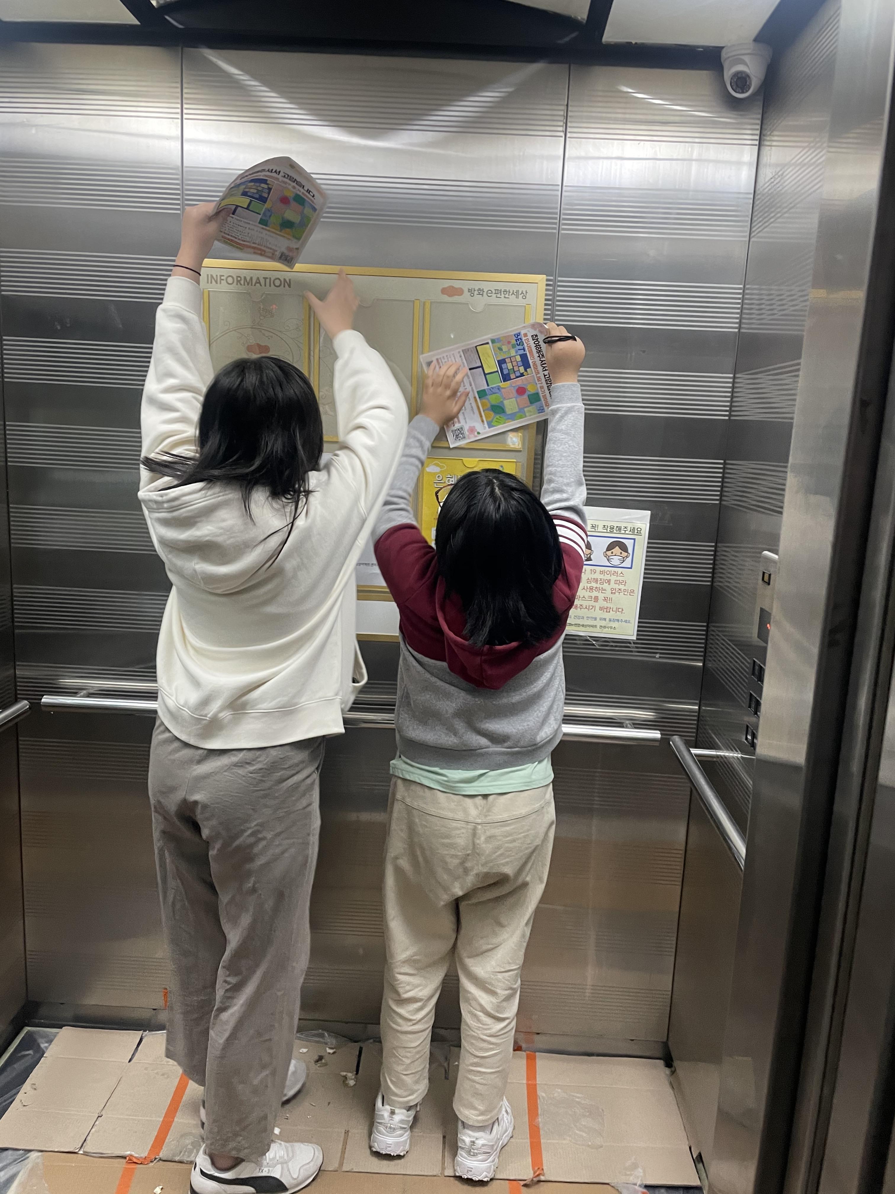 승강기에 붙어있는 인사캠페인 안내문과 붙임쪽지판을 이정이 정연이와 수거했습니다.