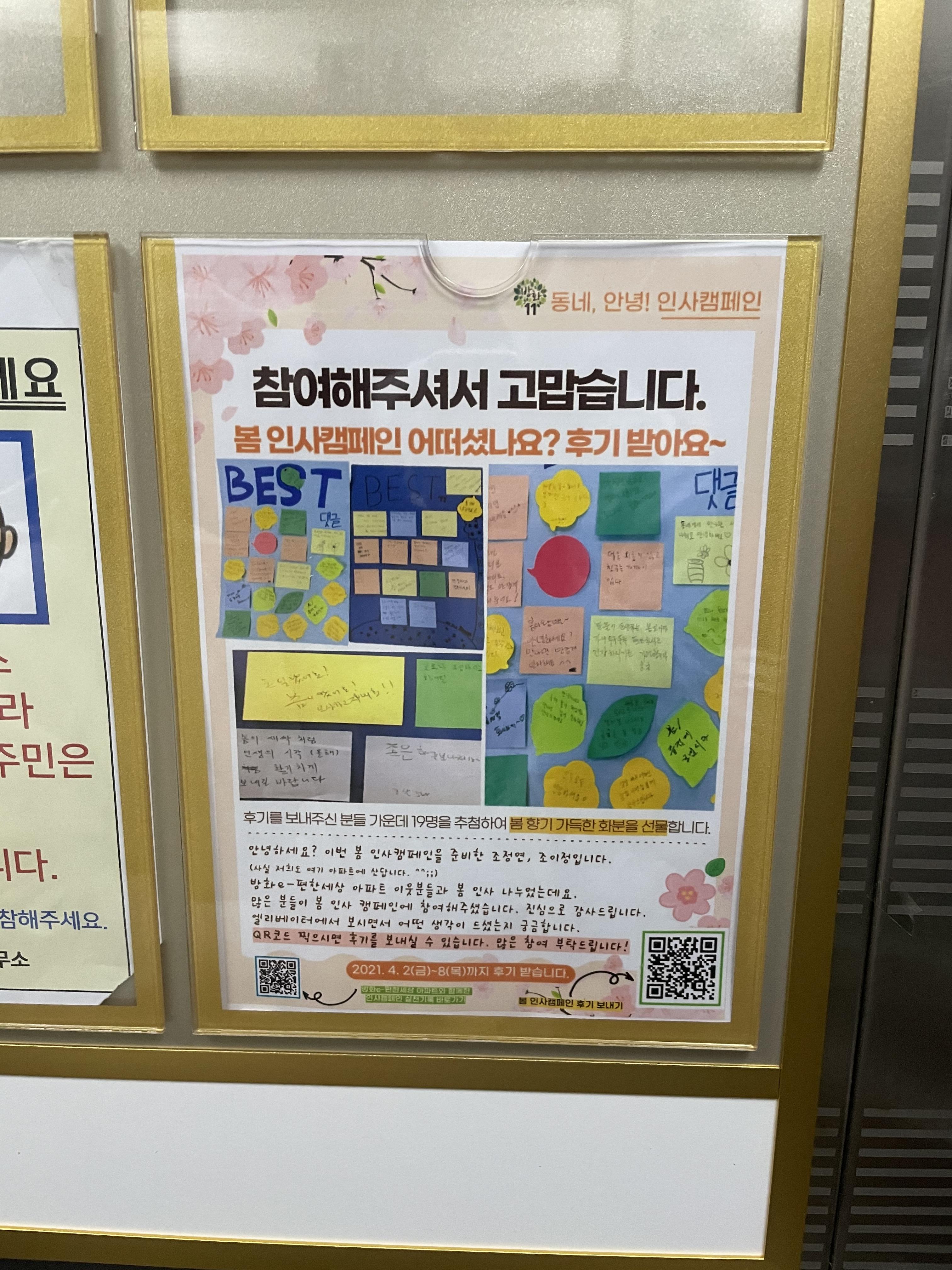 향후 인사캠페인 후기를 받기 위해 안내문을 새로 붙이기로 했으니 관리소장님께 인사드렸습니다.