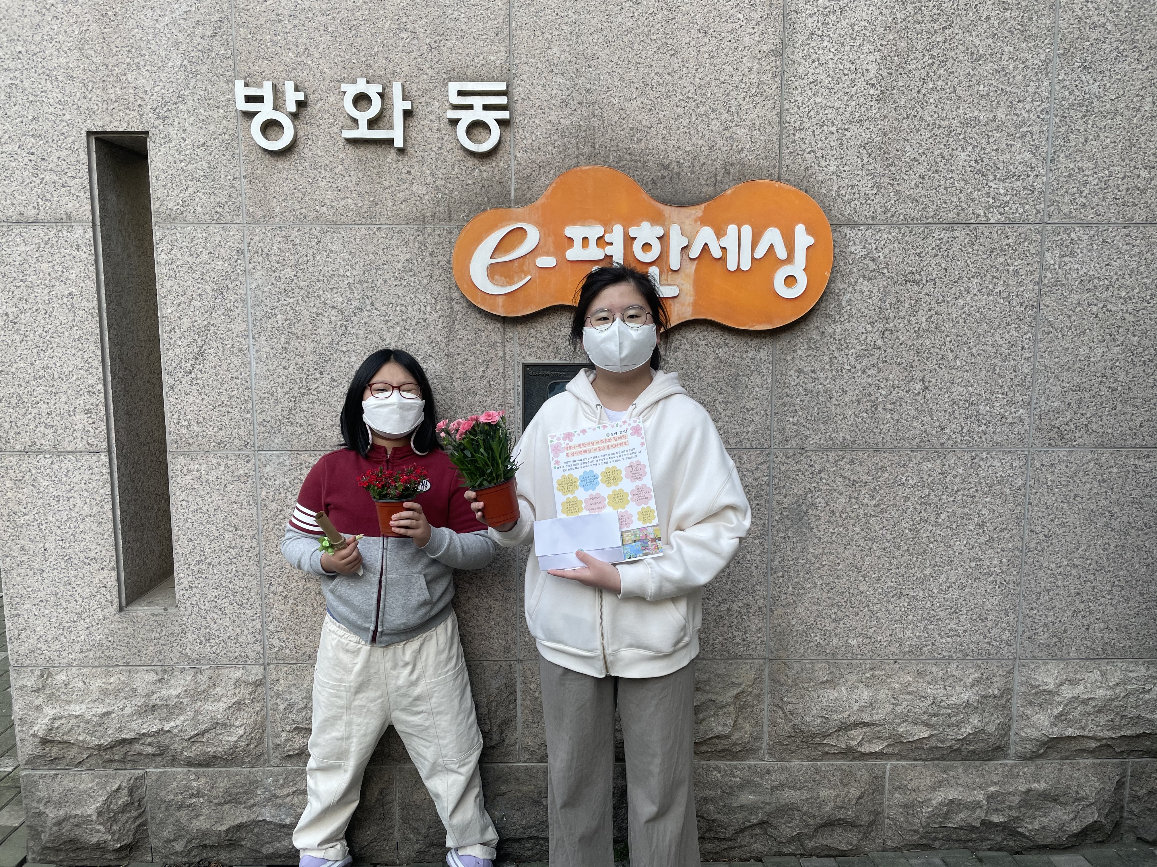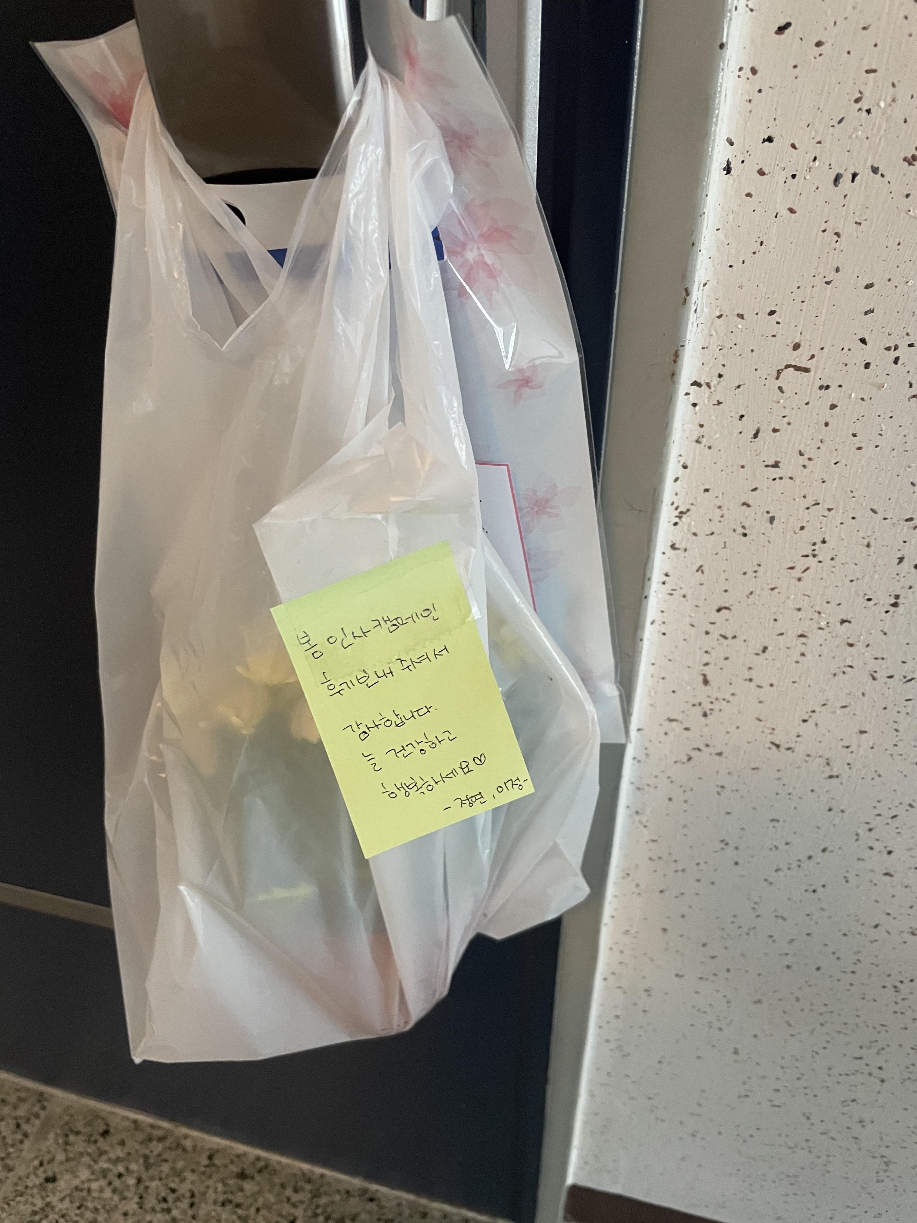 현관 문고리에 걸어달라고 하시는 분 등 다양한 방법으로 이정이 정연이와 봄 화분을 전달했습니다.