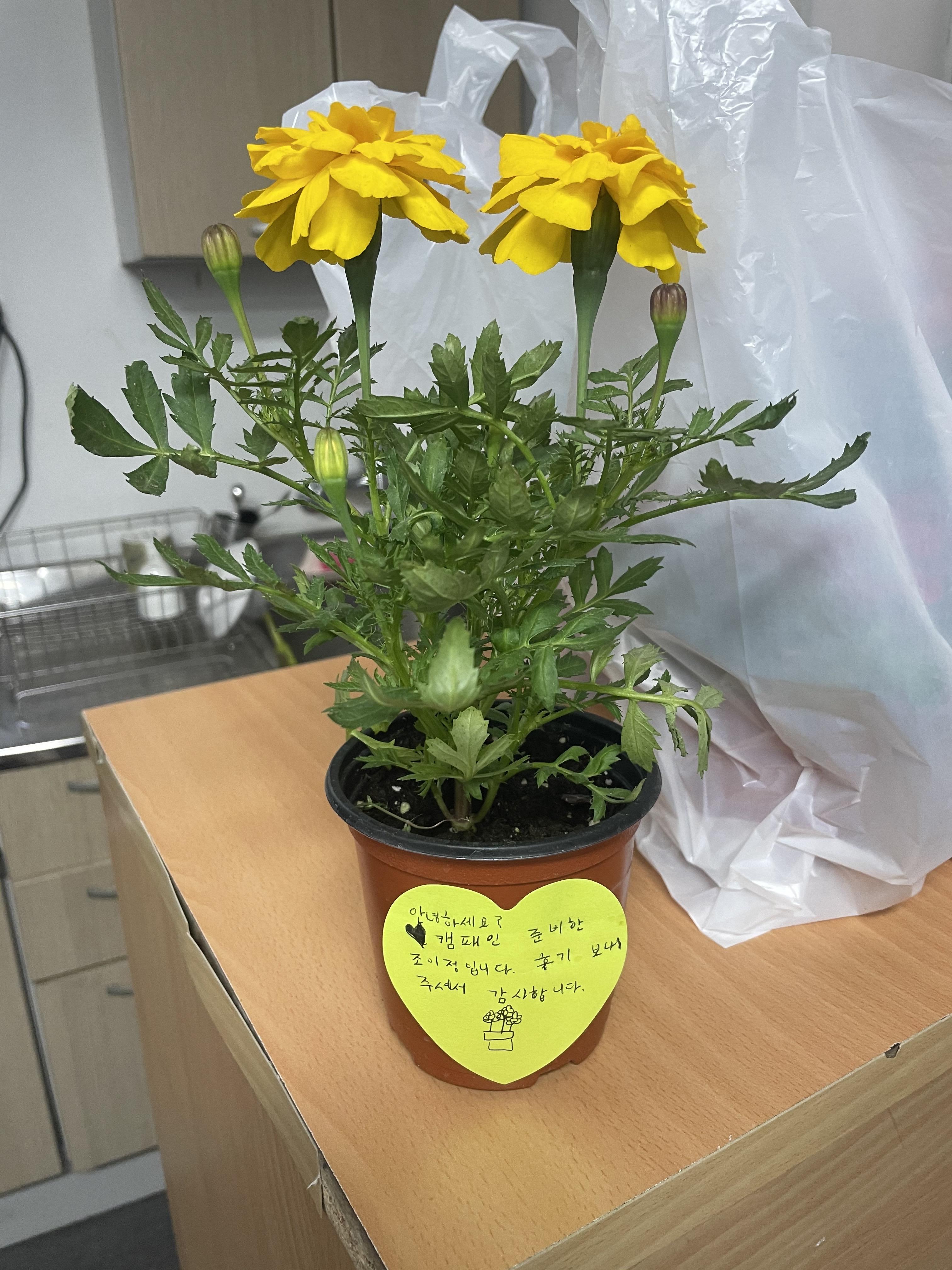 화분에는 이정이와 정연이의 감사인사가 적힌 쪽지도 들어있었습니다.