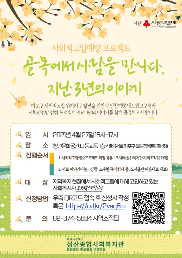 성산종합사회복지관에서 사회적 고립예방 프로젝트 공유회가 열리는 것을 알았습니다.