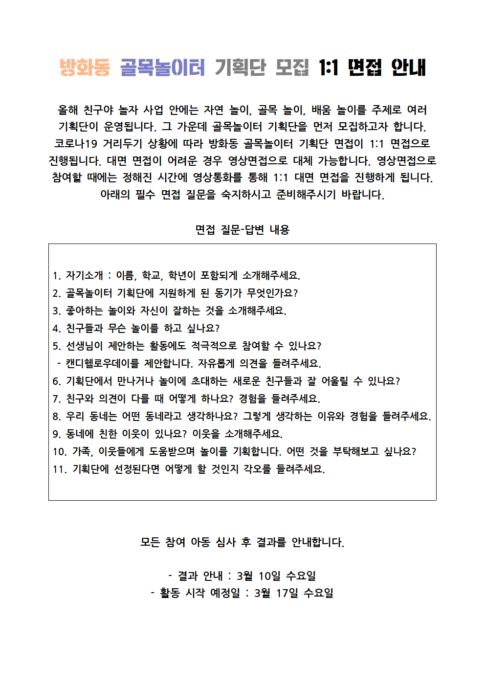 [친구야 놀자] 방화동 골목놀이터 기획단 면접이야기