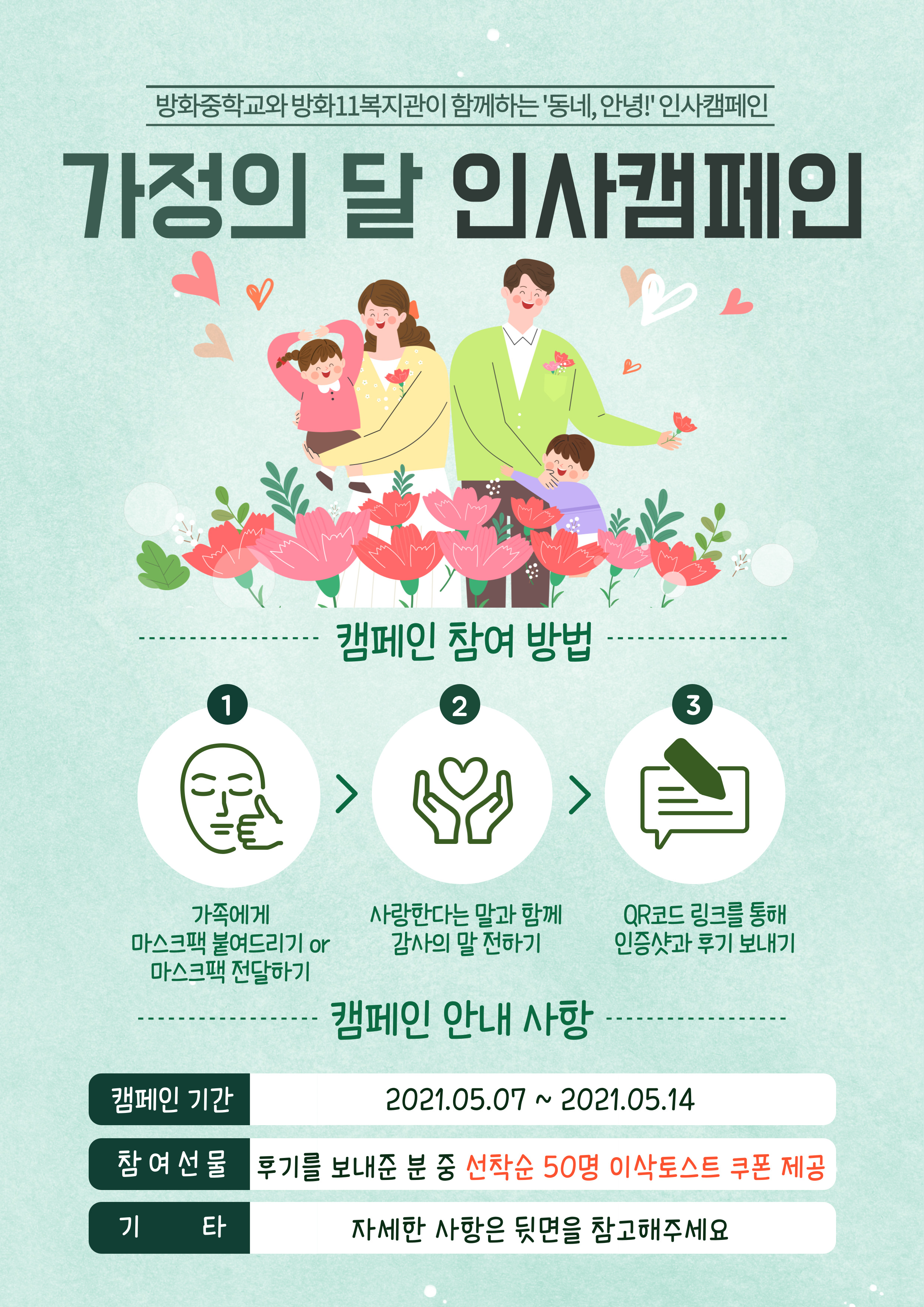 | [동네, 안녕!] 방화중학교와 함께하는 가정의달 인사캠페인 2 (1) | 2021.05.26 |