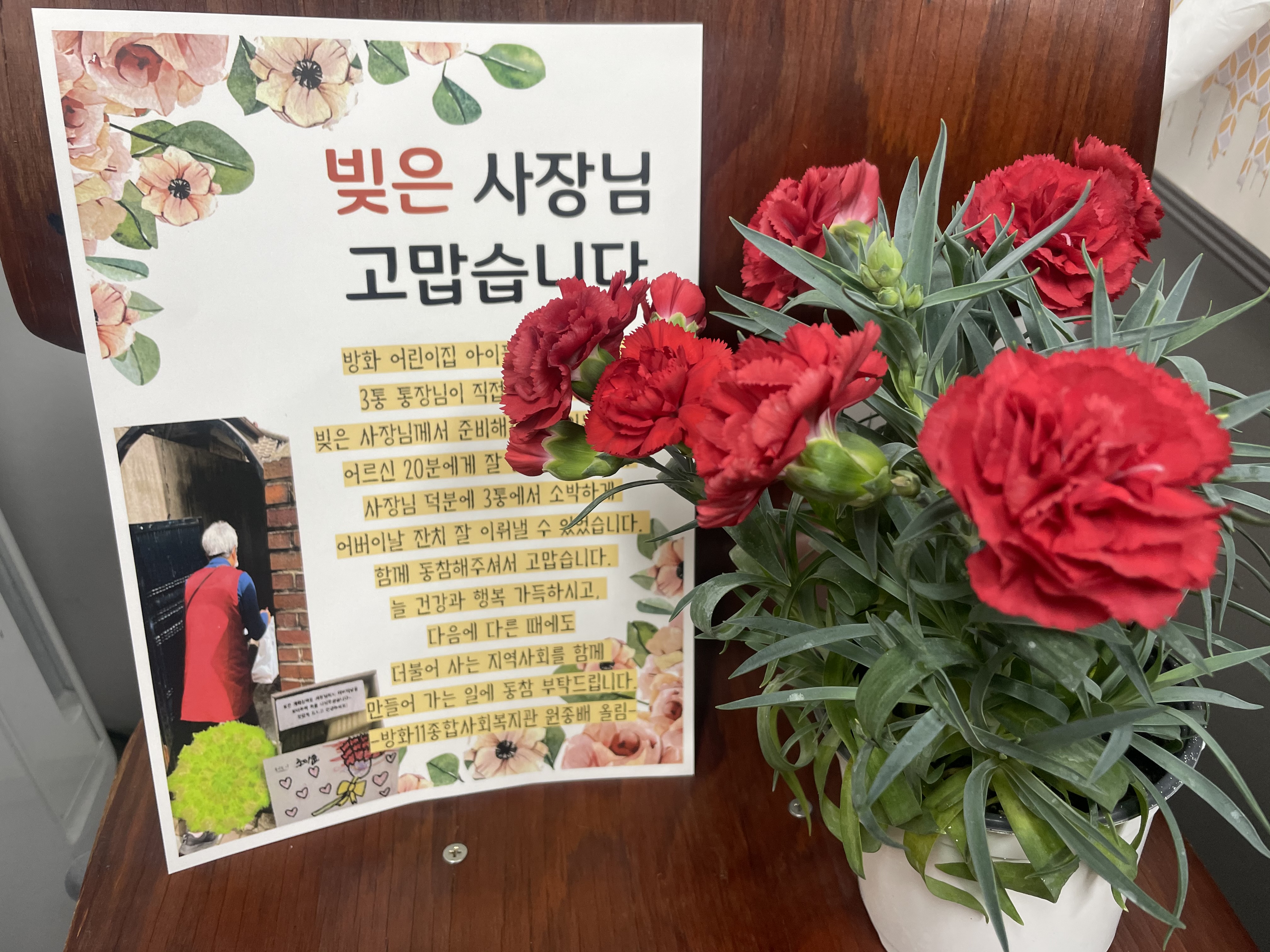 떡을 후원해 주신 빚은 개화산역 사장님께 카네이션을 드리며 감사인사 드리기 좋은 기회였습니다.