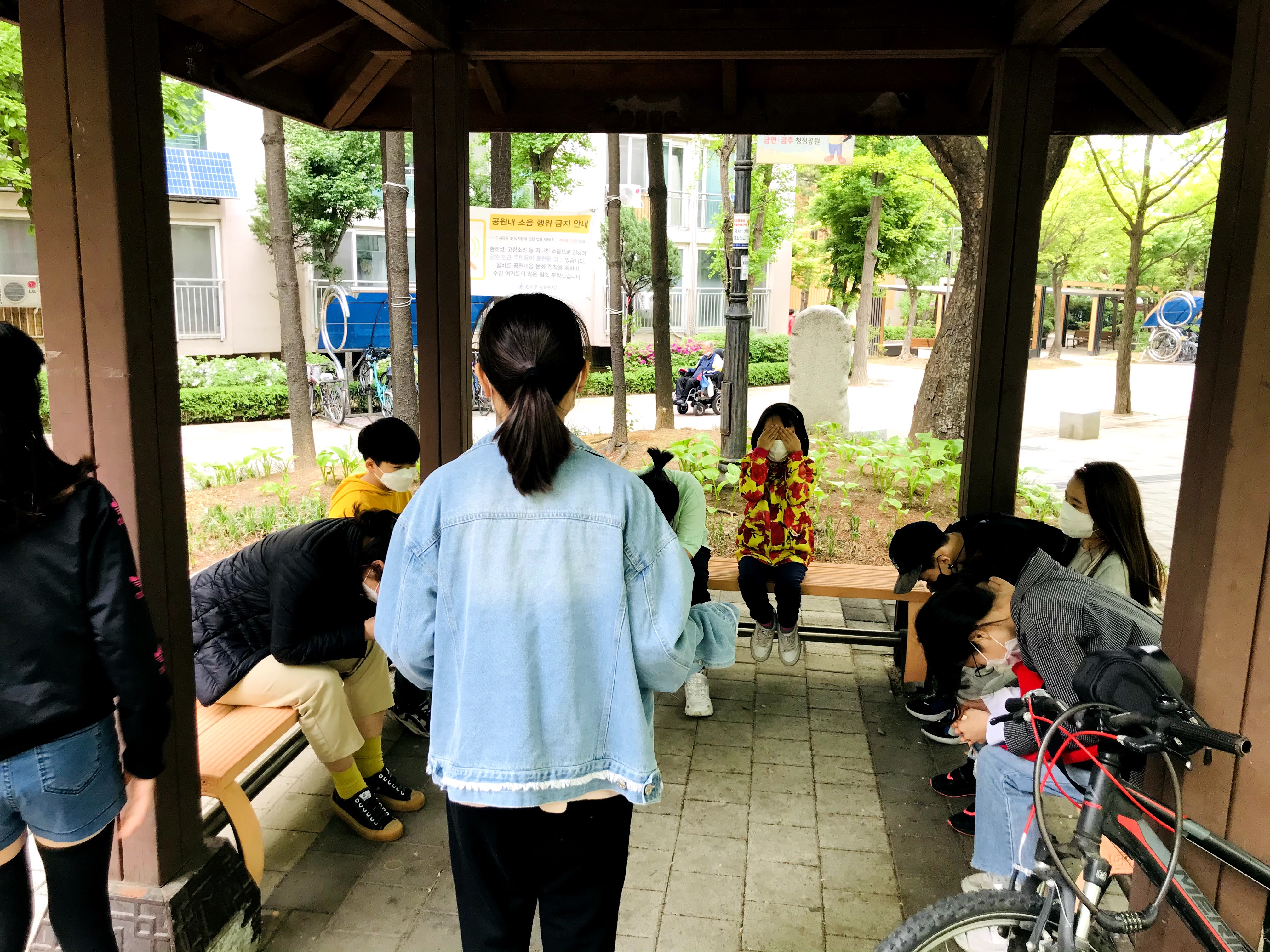선선하고 햇볕이 내리쬐는 공원 정자에 앉아서 마피아 놀이했습니다.