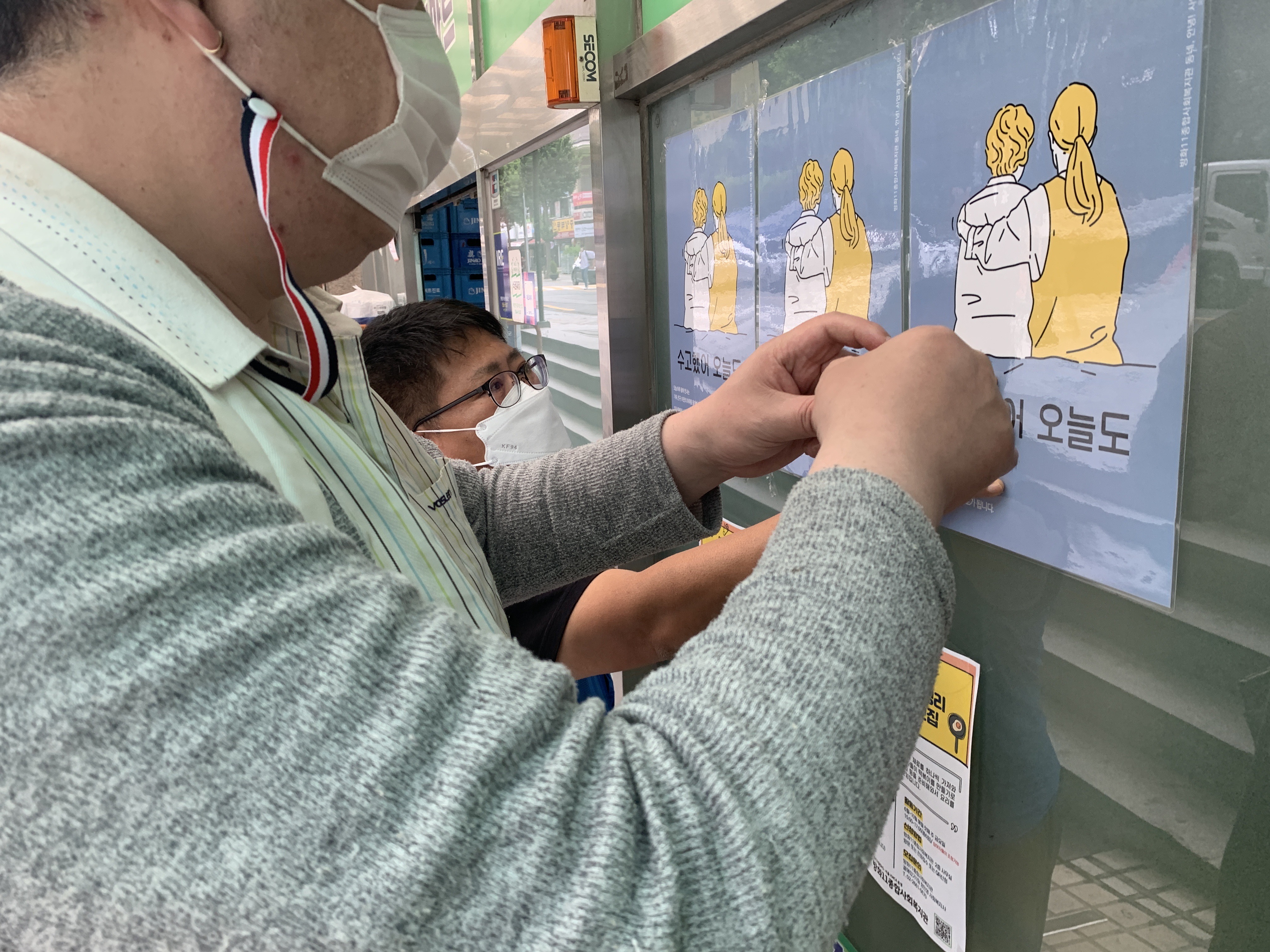 "복지관에서 좋은 문구를 담은 포스터를 상가에 매달 붙이고 있어요.