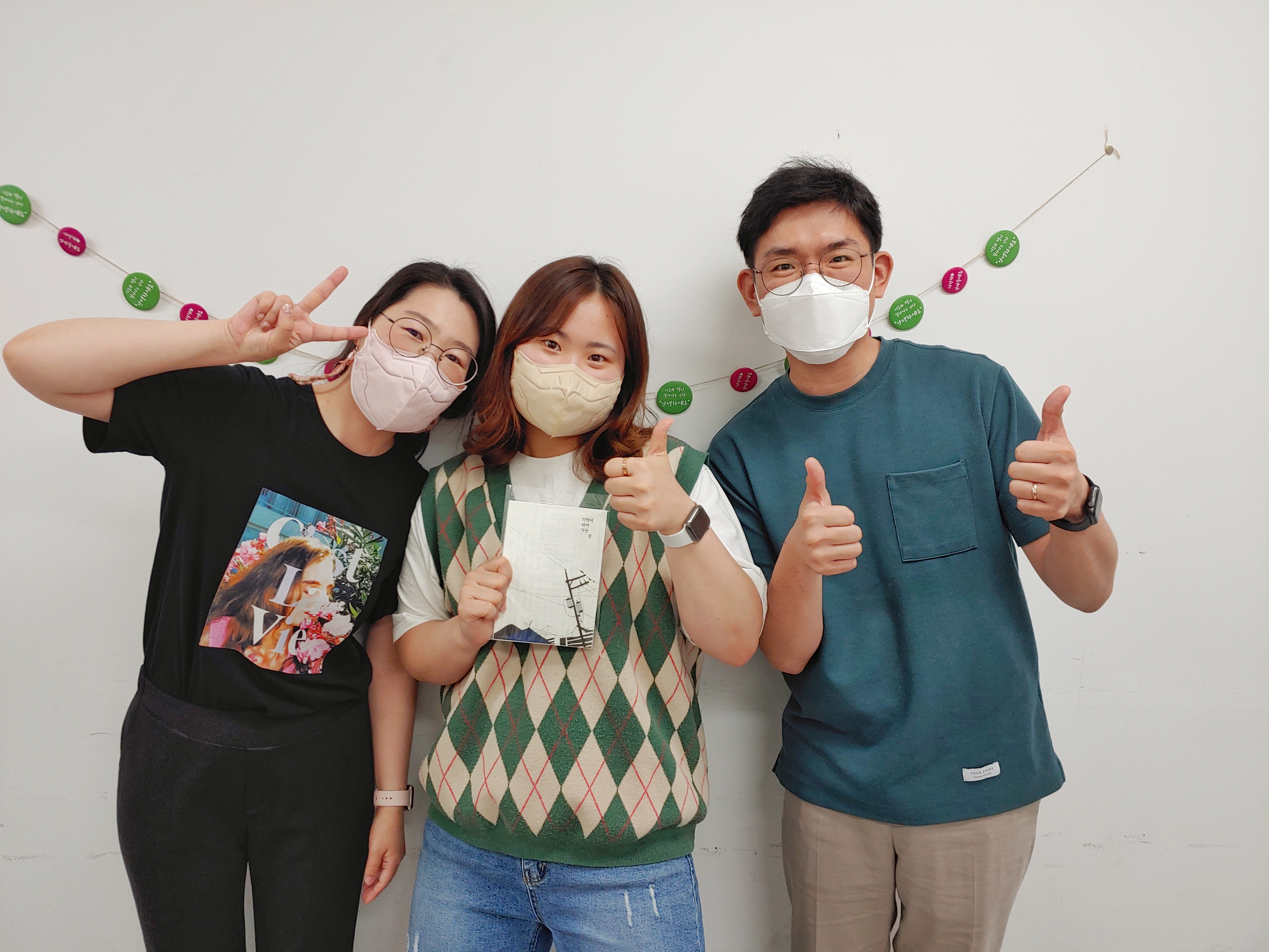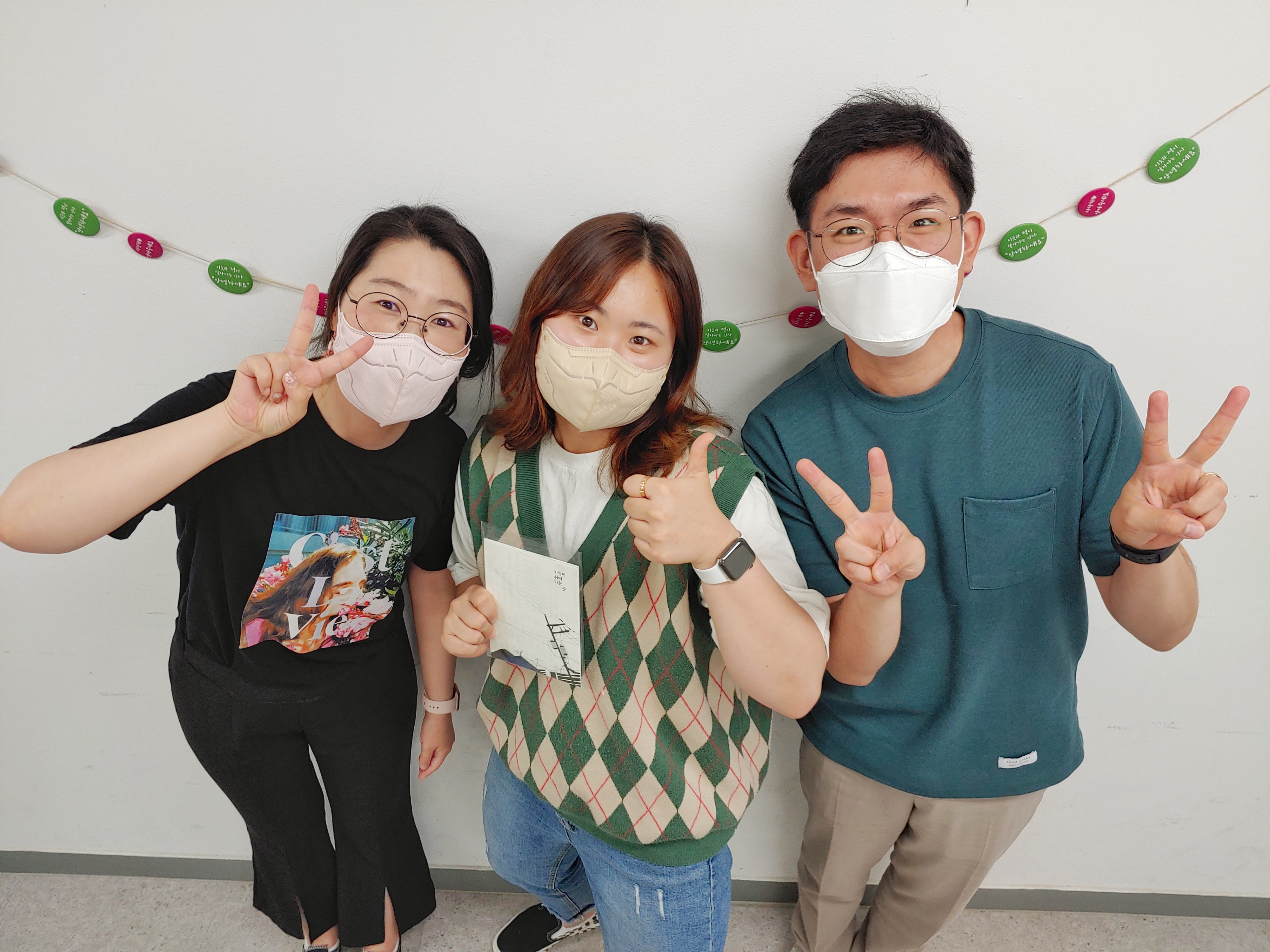동료들이 조금씩 마음을 모아 엽서와 간식을 준비했습니다.
