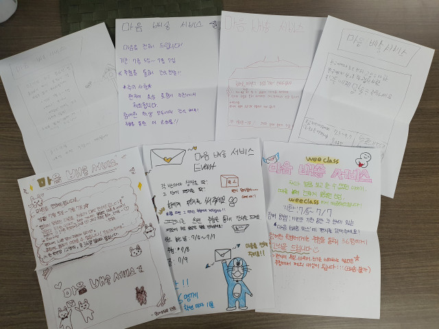 | 일정 6월 14일(월)~30일(수) - 포스터 제작, 상자 준비 7월 1일(목) - 학교 내, 페이스북에 홍보 포스터 게시 7월 2일(금) - 인사캠페인 준비(간식 구입, 상자 제작, 편지지 제작) 7월 5일(월)~7일(수) - 인사캠페인 진행 7월 8일(목) - 마음배송서비스 상자 수거, 참여자 선물 추첨, 편지 배송 준비 7월 9일(금) - 각 학급에 편지 배송 |