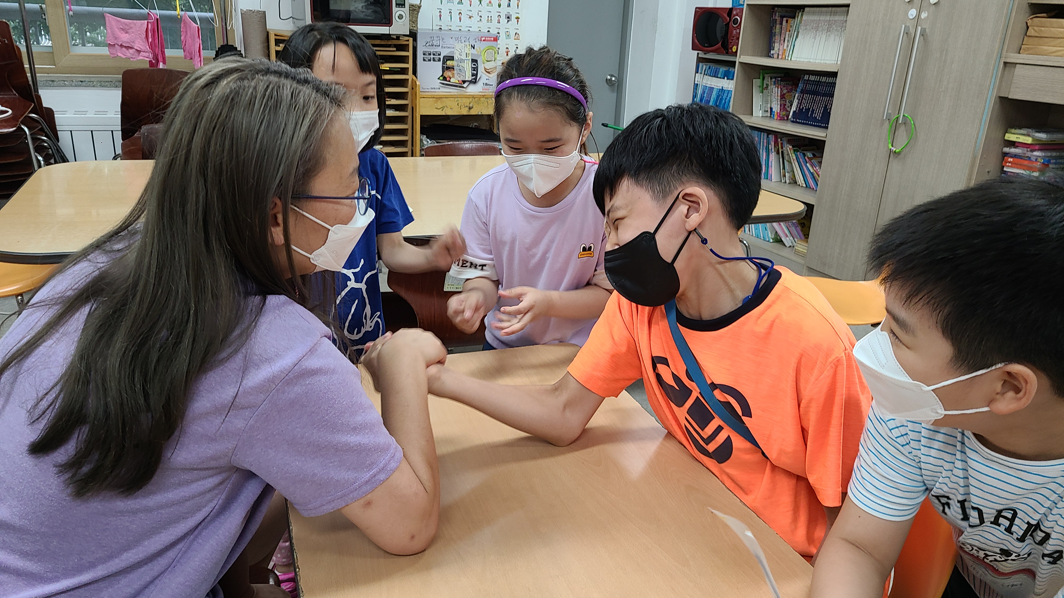 기획단 아이들 모두가 나은 어머니에게 팔씨름을 도전하고 즐길 수 있도록 해주셨습니다.
