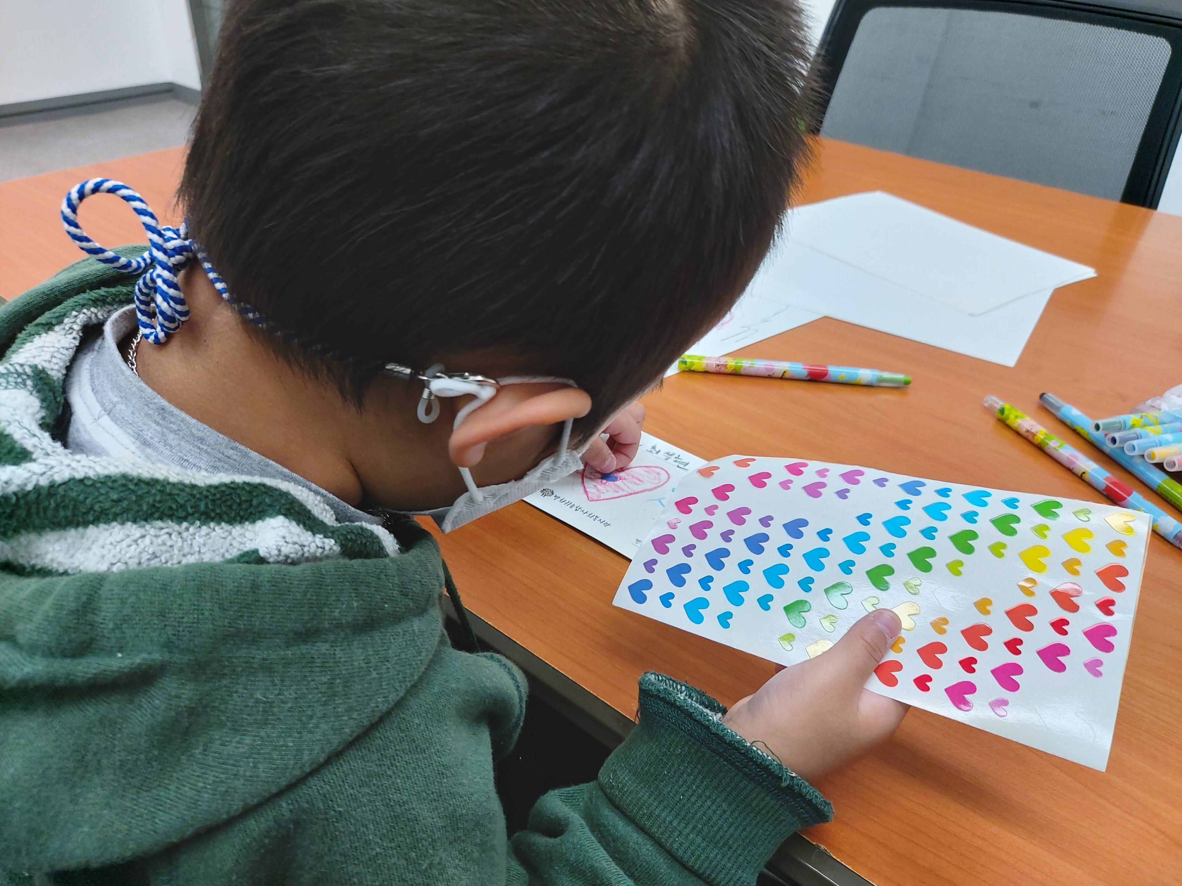 고사리손으로 선생님들에게 전할 엽서를 직접 준비했습니다.