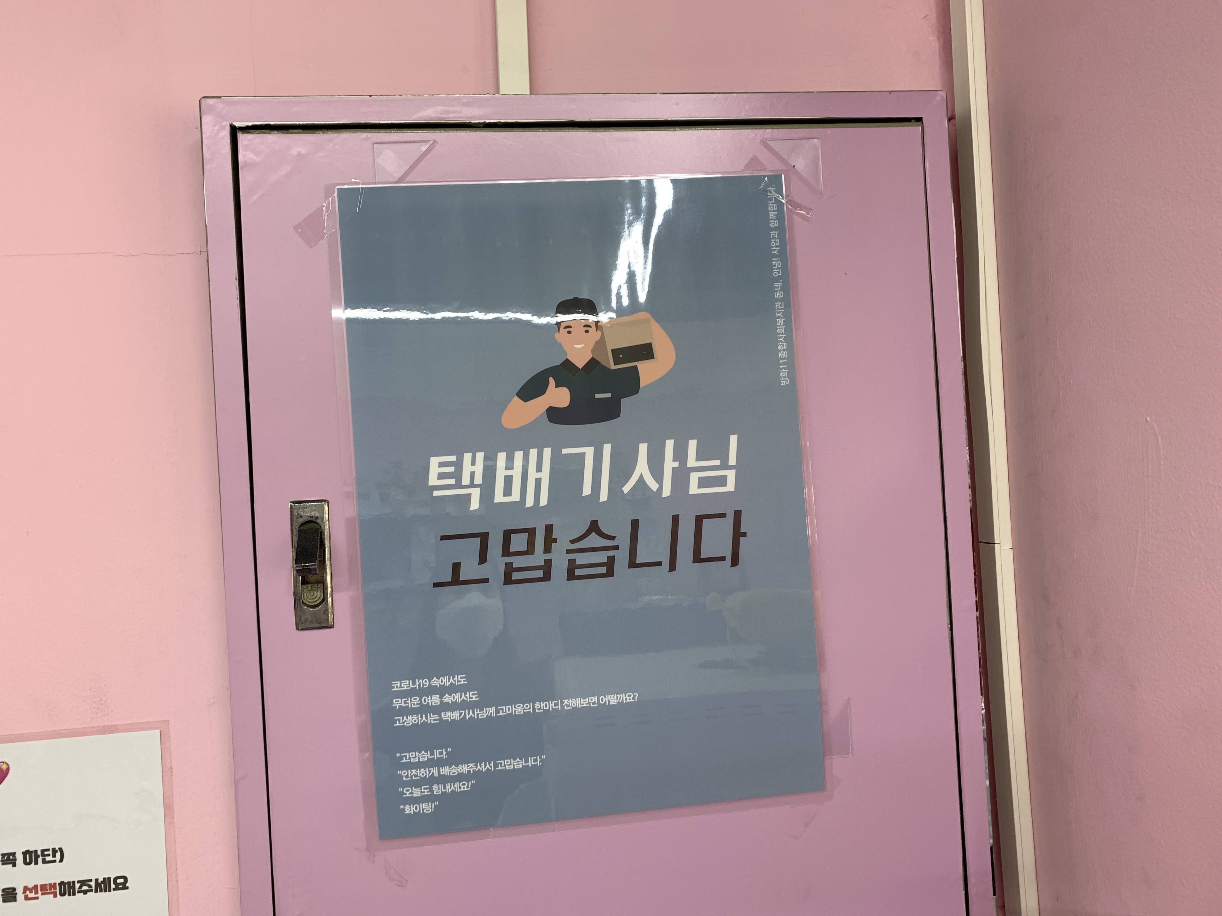 인사캠페인 포스터를 교체하고 있는 중에 마침 지나가던 택배기사님이 계셨습니다. 택배기사님이 바쁘셔서 제대로 이야기를 나누지는 못했지만 포스터를 보시고는 환하게 웃으시며 지나가셨습니다.