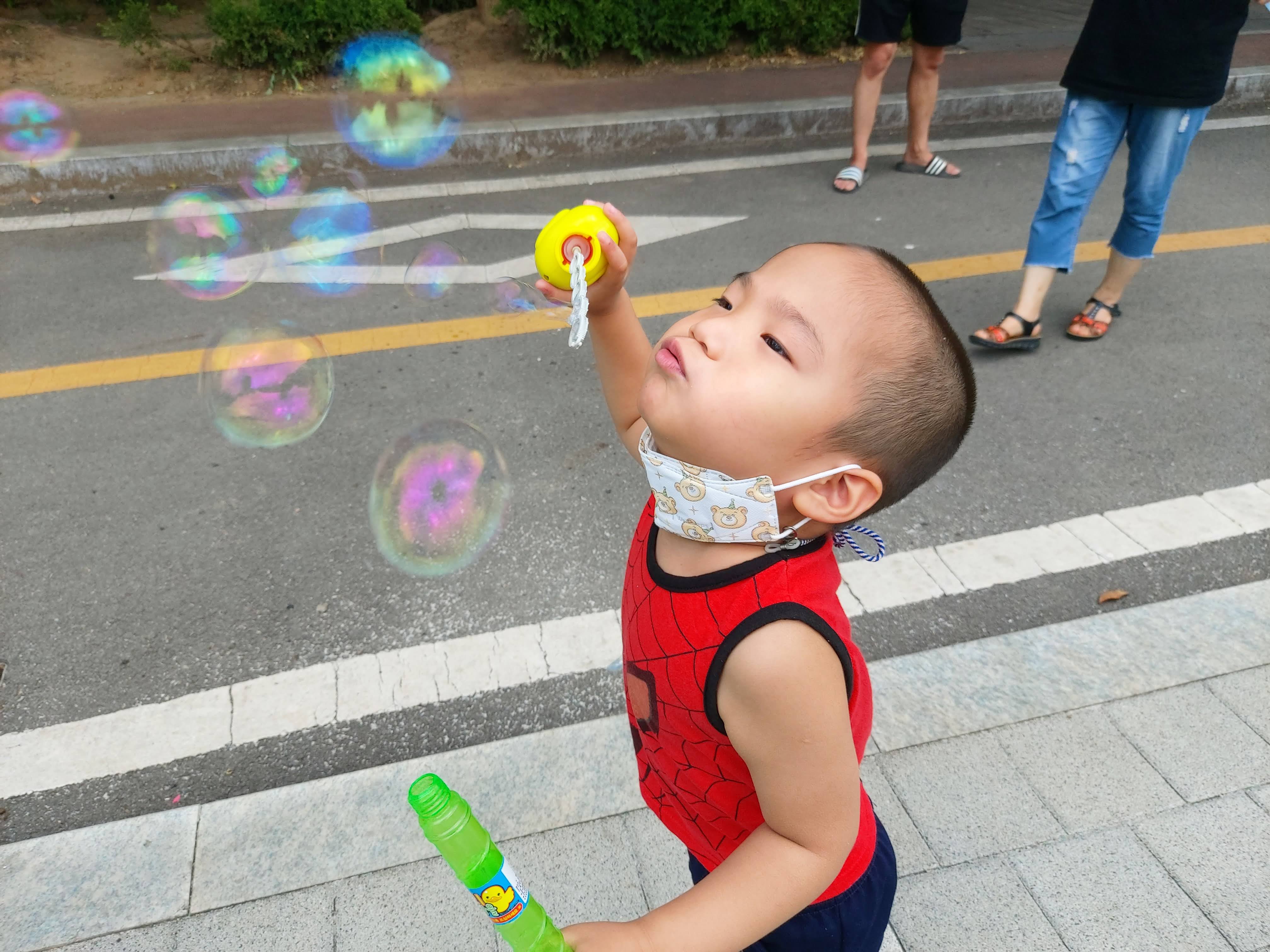 아빠, 할머니와 비눗방울 놀이도 하고 미끄럼틀도 타며 재미난 시간을 보냈습니다.