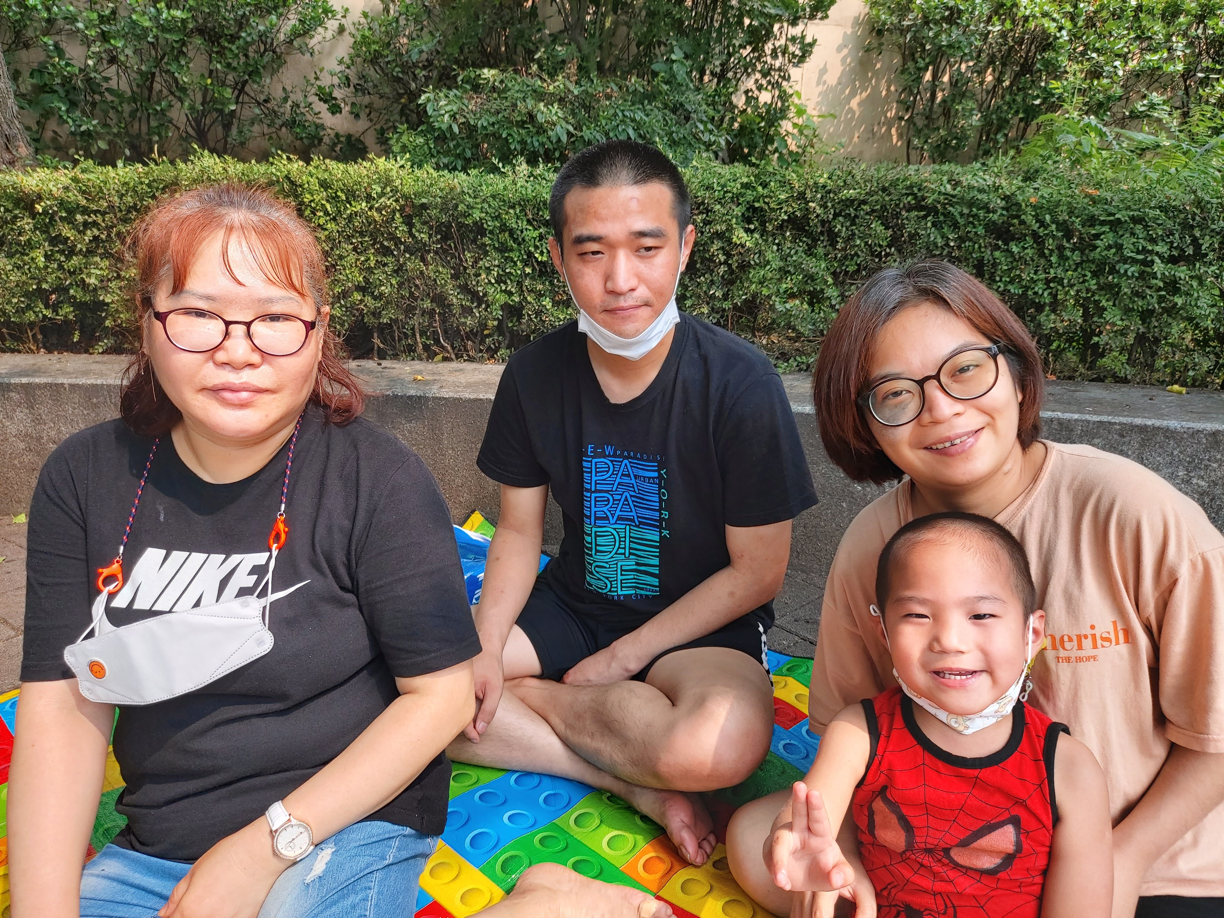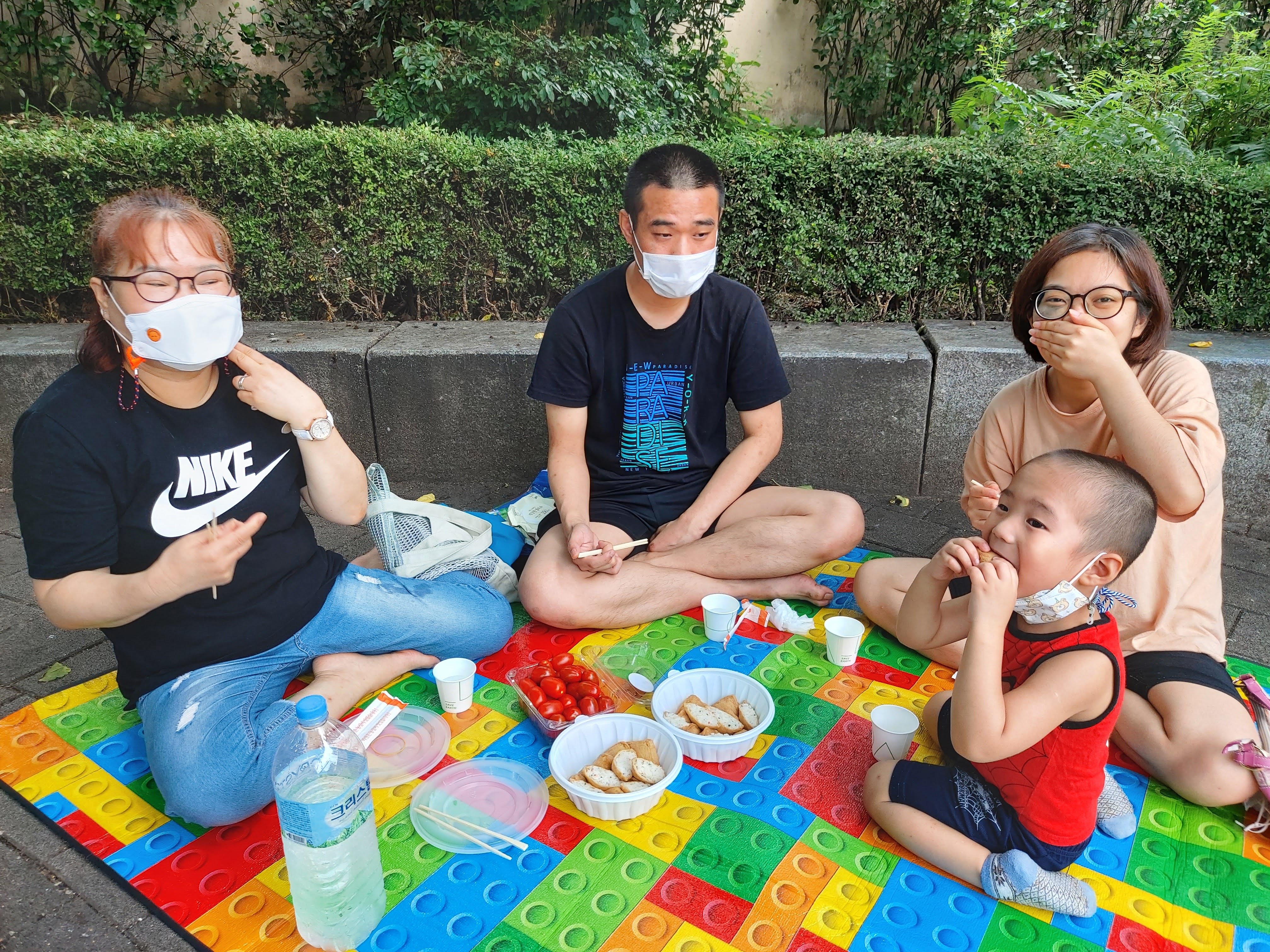 한적한 공원 한쪽에 돗자리를 펴고 앉아 도시락도 먹고 예쁘게 가족사진도 찍었습니다.
