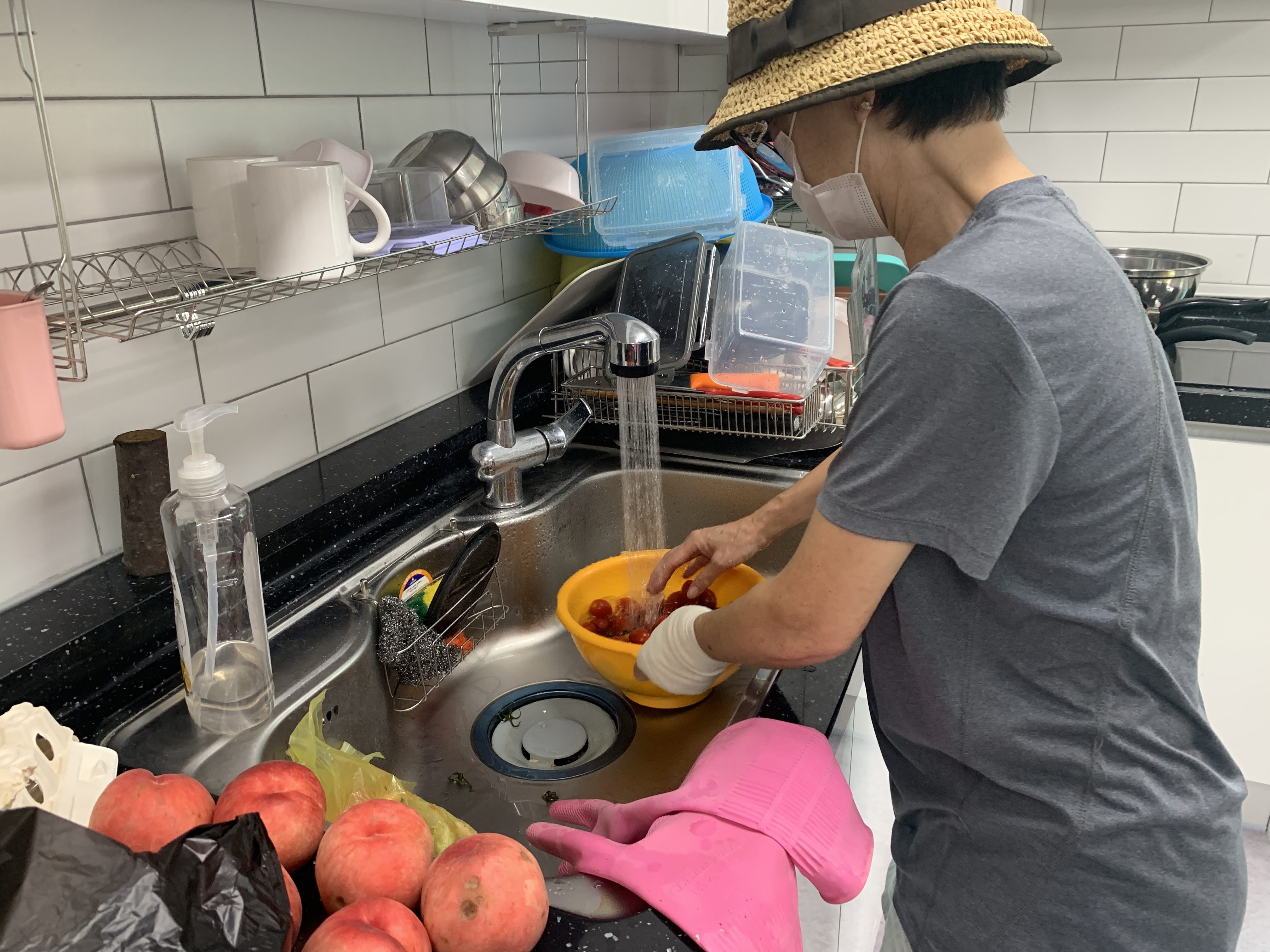 복지관에 돌아와 손수 과일을 씻고 반찬통에 정성껏 옮겨 담았습니다.