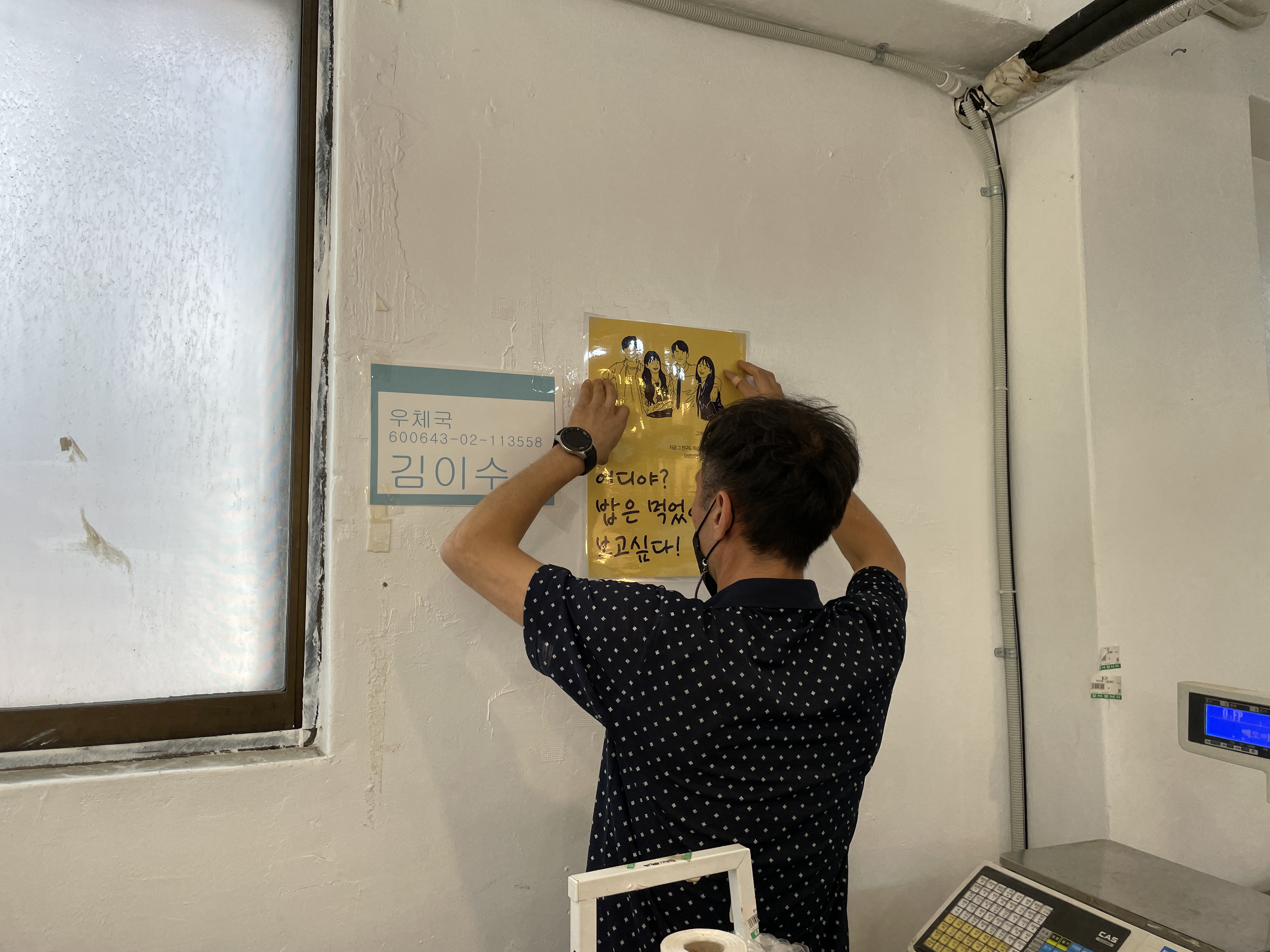 장사에 방해가 될까 급히 인사드리고 간략히 말씀드리며 문 밖에 붙이려고 나왔습니다.
