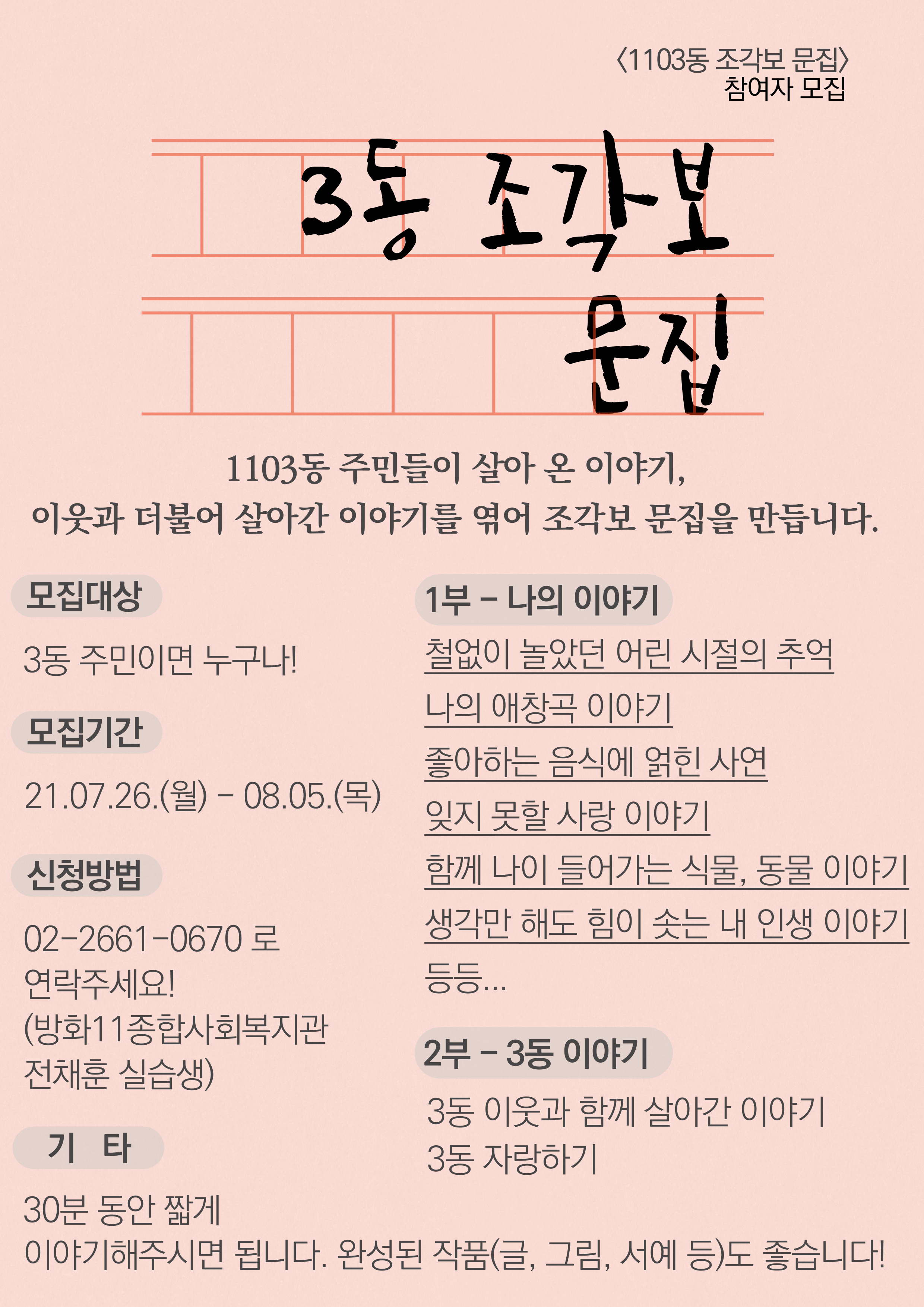 【경기북부탑뉴스】방화11종합사회복지관(관장 김상진)은 찾아가는 도서관 ‘3동 조각보’ 문집 사업을 진행했다. ‘3동 조각보’는 방화11단지아파트 1103동 주민들이 살아온 이야기를 엮어 한