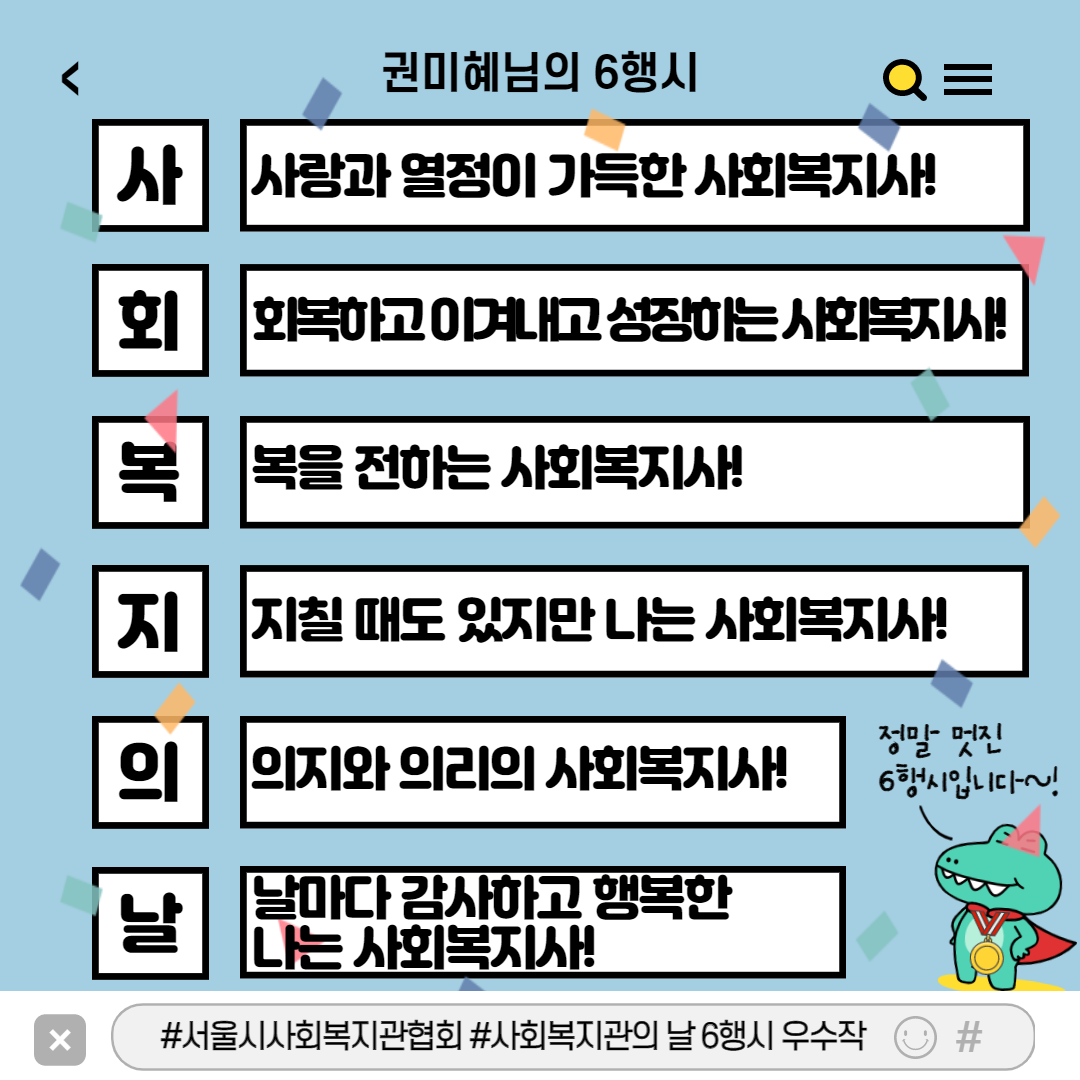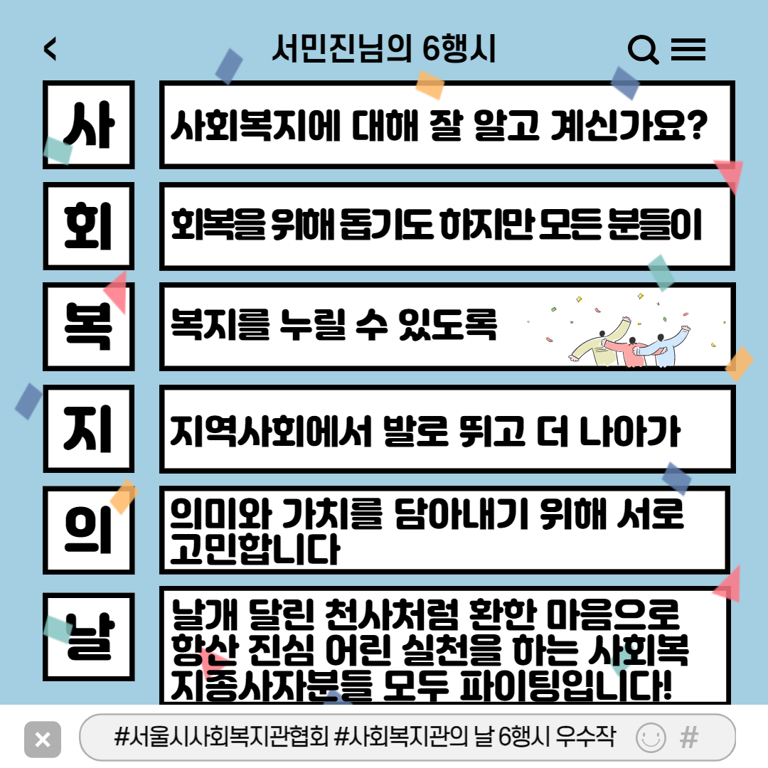 제 22회 사회복지의 날을 기념하여 '사회복지의 날 6행시' 이벤트를 진행하였습니다.