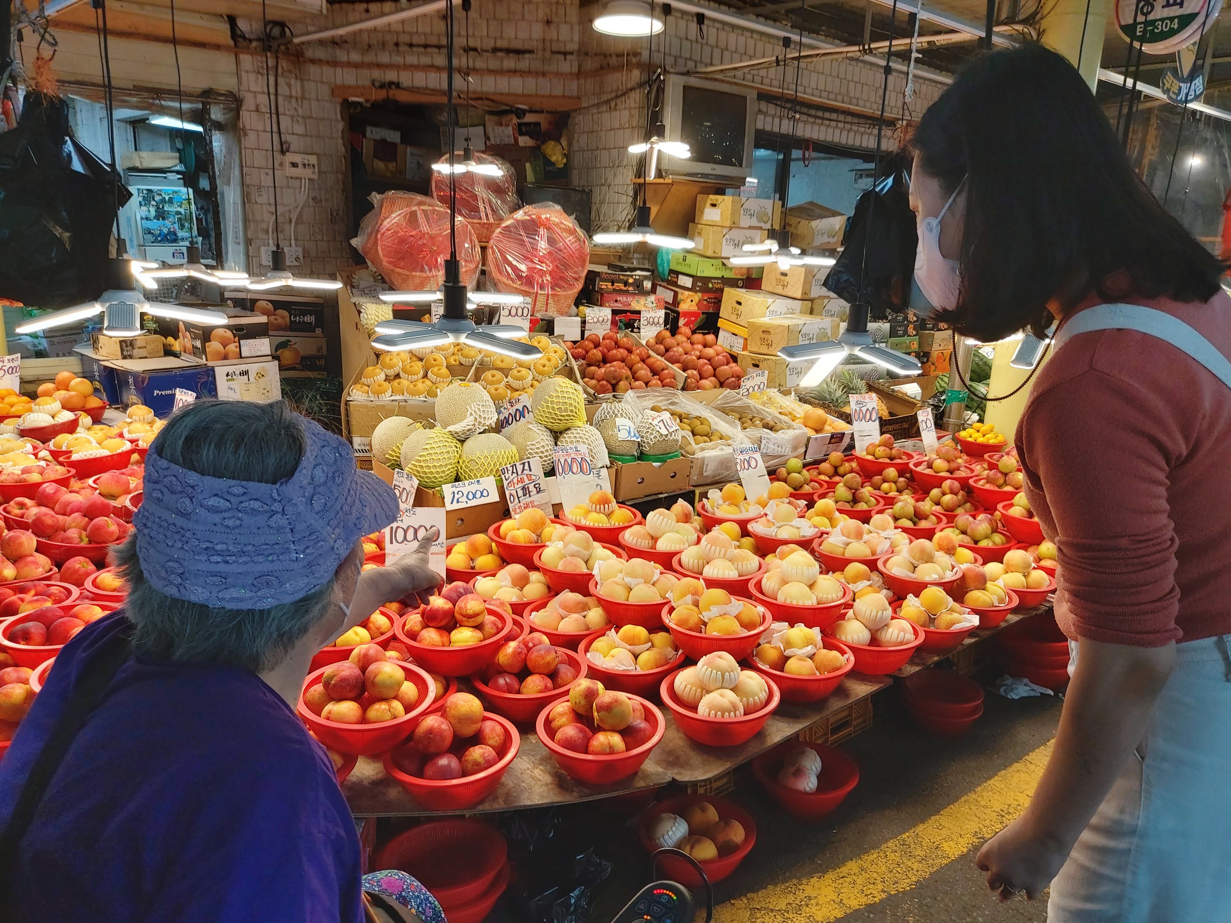 어르신이 과일가게 사장님께 이것저것 물어보시며 오늘 좋은 과일이 있는지 확인하셨습니다.