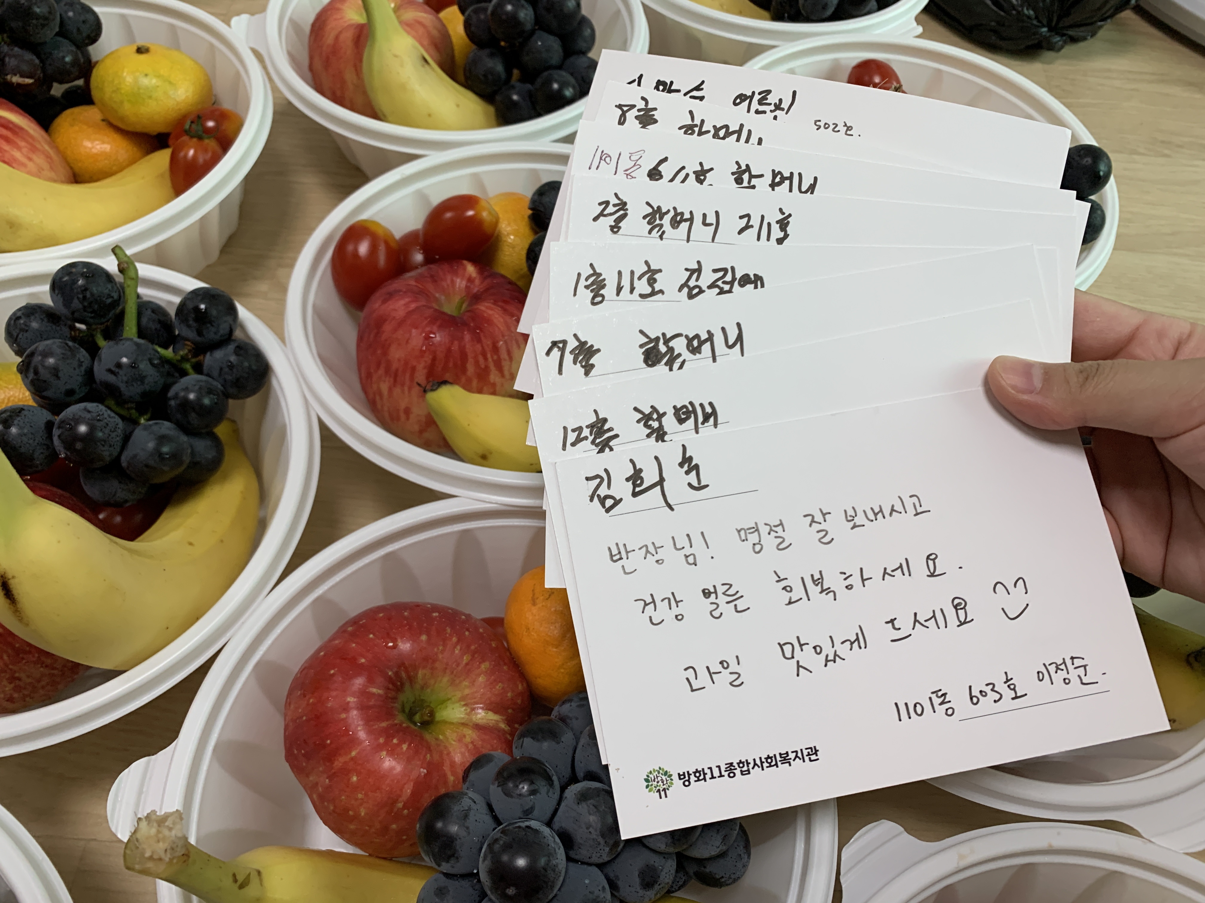 과일을 나눠주는 짧은 시간이었지만 문 앞에서, 복도에서 이야기 나눴습니다.