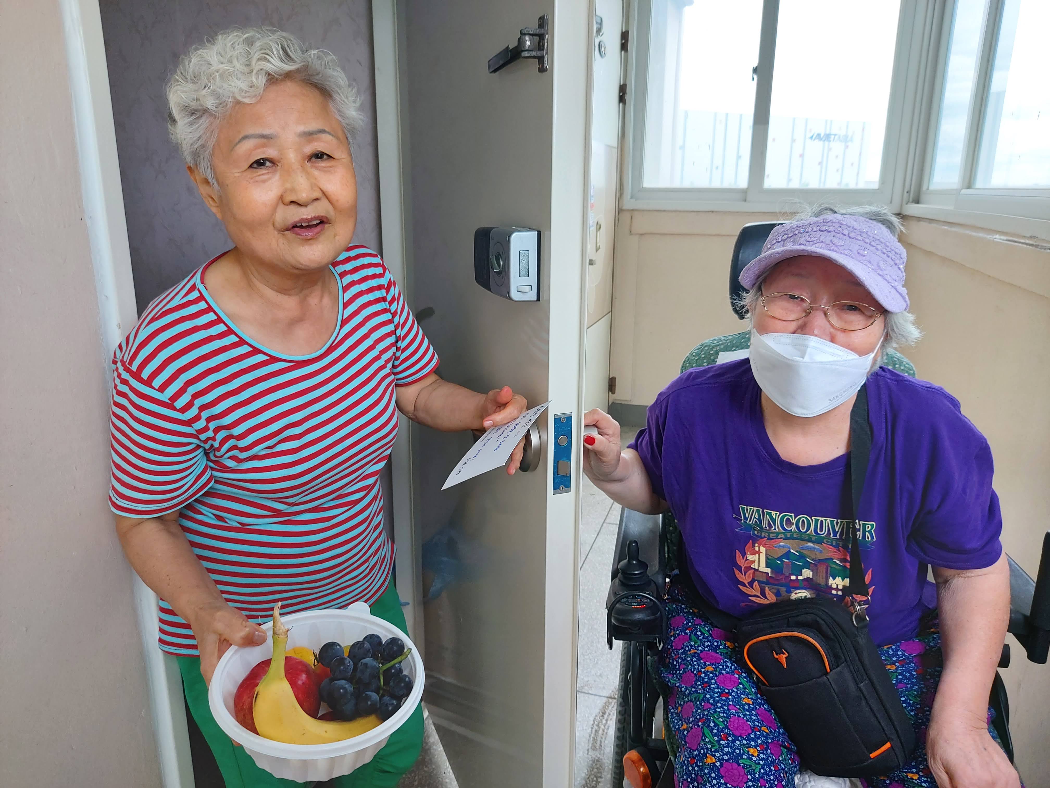 항상 고맙게 생각했는데 몸이 이래서 뭐 도울 일도 없고, 줄 것도 없고. 이번에 과일이 생겨서 나눠요.”