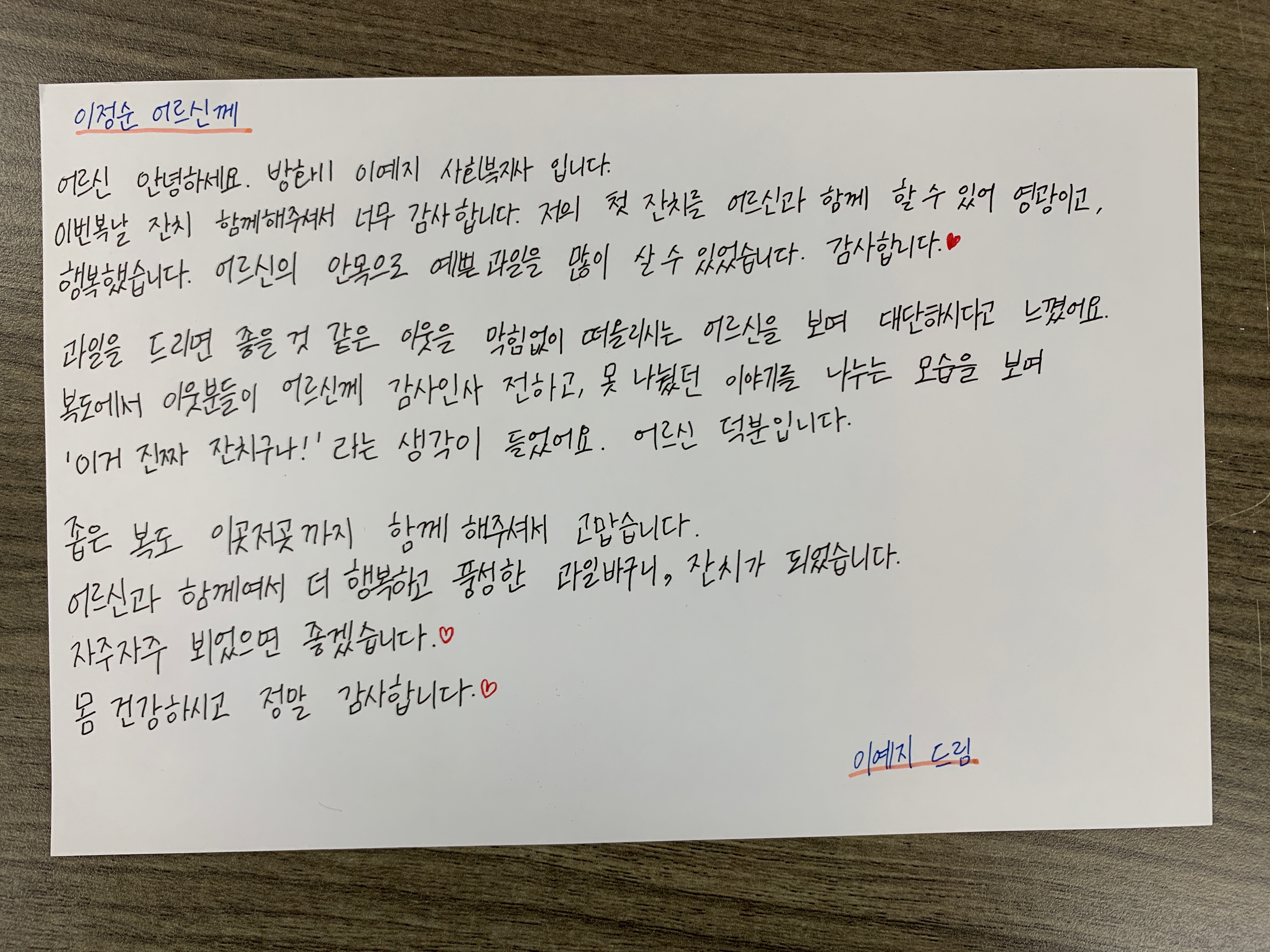 이정순 어르신께 이번 복날 잔치 함께해주셔서 정말 감사합니다. 저의 첫 잔치를 어르신과 함께 할 수 있어 영광이고, 행복했습니다. 어르신의 안목으로 예쁜 과일을 많이 살 수 있었습니다. 감사합니다. 과일을 드리면 좋을 것 같은 이웃들을 막힘없이 떠올리시는 어르신을 보며 대단하시다고 느꼈어요. 복도에서 이웃분들이 어르신께 감사 인사 전하고, 못 나눴던 이야기를 나누는 모습을 보며 ‘아, 이거 진짜 잔치구나!’라는 생각이 들었어요. 어르신 덕분입니다. 좁은 복도 이곳저곳까지 함께 해주셔서 고맙습니다. 어르신과 함께여서 더 행복하고 풍성한 과일바구니, 잔치가 되었습니다. 자주 뵈었으면 좋겠습니다. 몸 건강하시고 정말 감사합니다. |