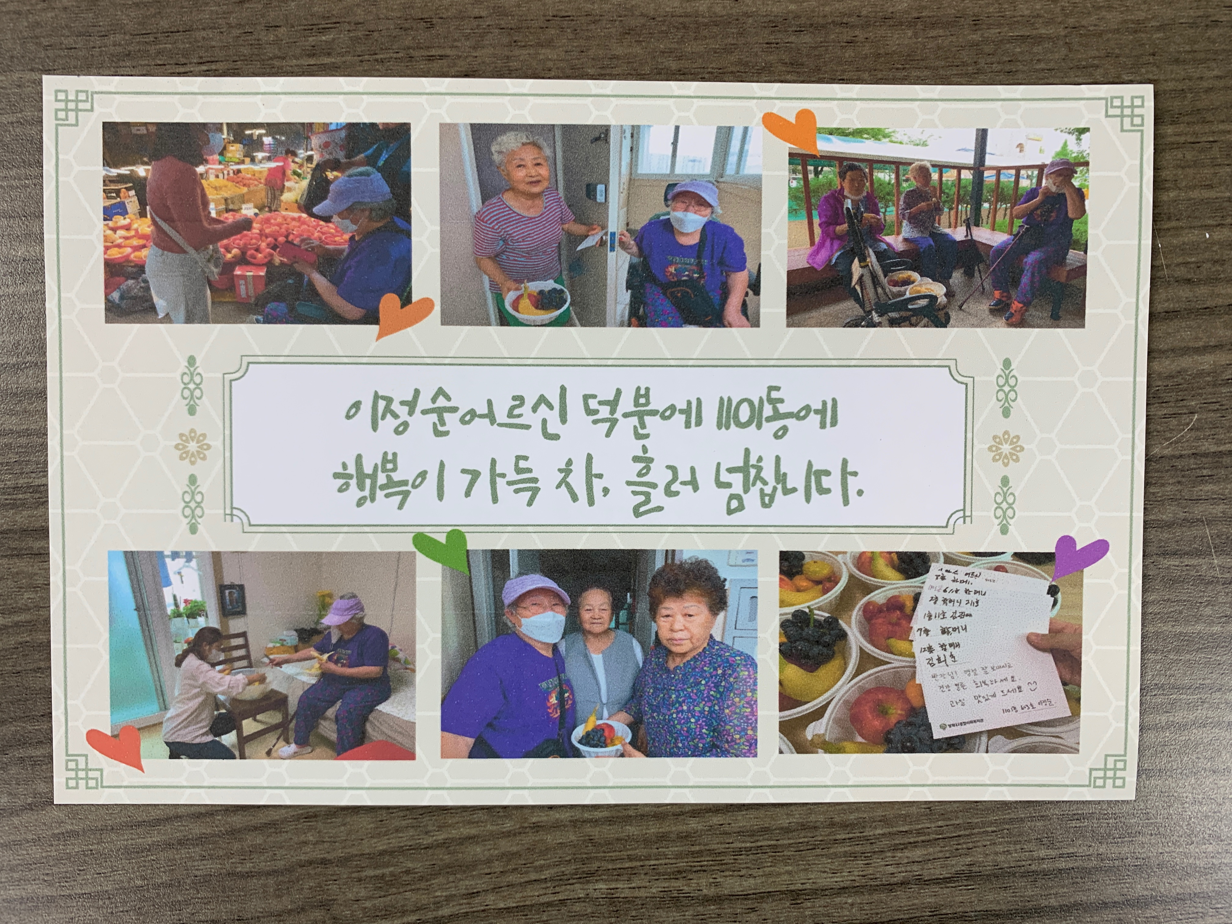 복날 잔치를 하며 이정순 어르신이 1101동 어르신들과 함께 찍은 사진을 엮어 엽서를 만들기로 했습니다.