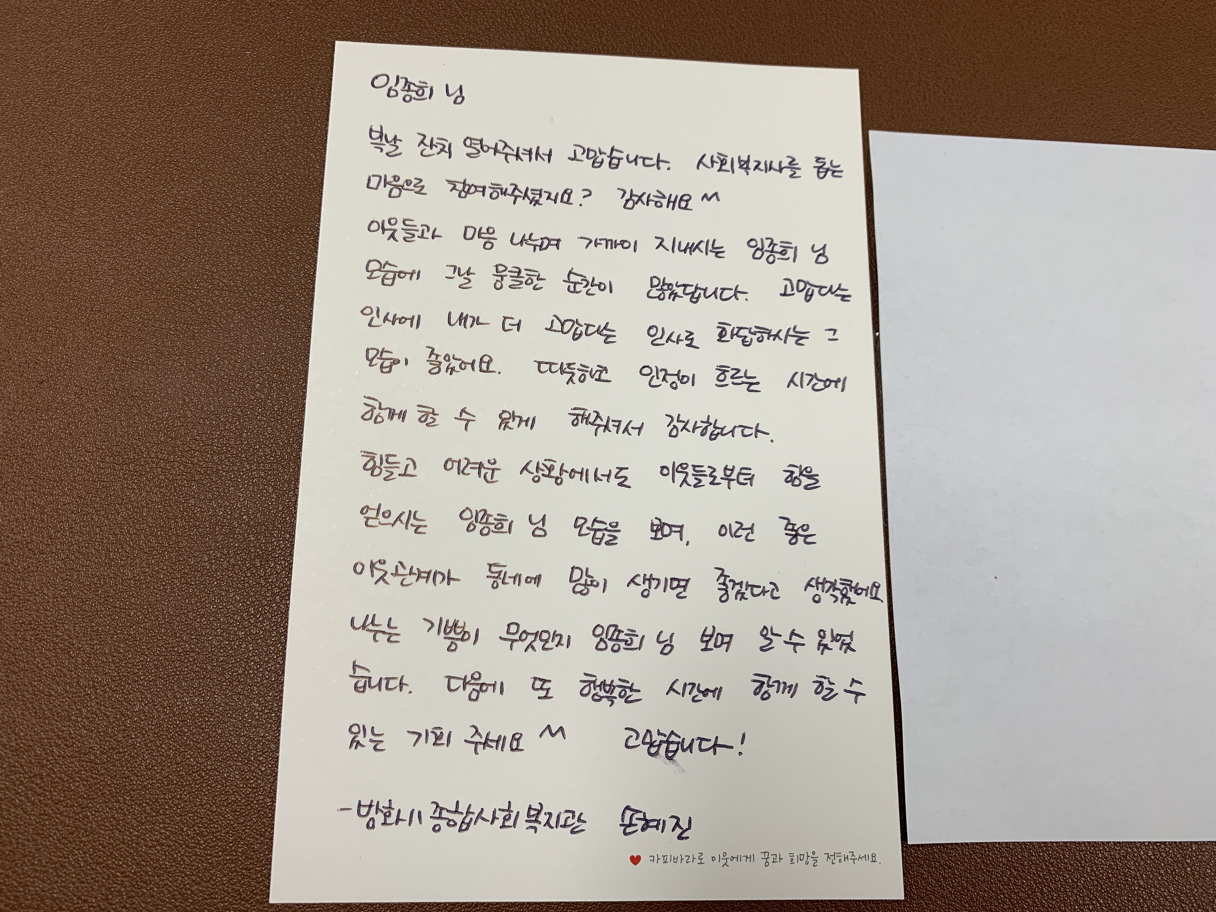 사회복지사가 제안했을 때 어떠셨어요? 이런 게 처음이었는데 거부감이 들거나 그러진 않았어요. 처음에는 선생님을 돕는 마음으로 참여했어요. 선생님한테 도움을 많이 받았잖아요. 오히려 선생님이 나한테도 도움을 요청할 때가 있구나 싶어서 감사했죠. 이번에는 도움 드릴 수 있으니까요. 처음에는 선생님을 돕는 거라고 생각했는데 돌아보면 나를 위한 시간이었어요. 제안해줘서 고마웠어요. 직접 시장가서 과일 사고 용기도 사서 이웃들과 나누셨는데 어떠셨어요? 기분 좋았어요. 평소에는 걱정거리가 많아서 생각이 복잡한데 그 시간은 오로지 그 일만 생각하니까 좋았어요. 내가 좋아하는 이웃들 생각하면서 과일도 고르고요. 참 행복했어요. 잔치 이후에 무엇이 달라졌나요? 전에도 이웃들과 소소하게 나누면서 지내긴 했지만 복날에도 챙겨드릴 수 있어서 좋았어요. 서로 성향도 맞고 마음도 잘 맞는 사람들인데 이웃들을 자랑하고 싶은 마음이 더 들었어요. 마음을 나누는 사람들이라서요. 다음에도 잔치에 참여할 마음이 있으신가요? 그럼요. 얼마든지 내가 할 수 있는 거는 하죠. 이웃들한테 나눌 때 부담은 없어요. 이 활동을 이웃들에게 제안하고 싶으신가요? 이웃이랑 나누고 편지 쓰고 고맙다고 인사 나누는 것을 생각하면 누군가한테 제안하고 싶어요. 평소에 못 하던 일을 이 기회에 할 수 있는 거잖아요. 이런 활동이 활성화되면 좋겠어요. 서로 교류할 수 있고, 이웃 관계 좋아지고, 아는 사람도 많아지고 참 괜찮다고 봐요. 소박하게 나누는 방식은 어떠셨어요? 소박한 방식이라 더 좋아요. 거창하고 많다고 해서 좋은 것만은 아니에요. 작더라도 내 마음이 100% 고스란히 담겼으면 충분하죠. 받는 사람도 ‘이 사람이 어떤 마음으로 했겠구나’ 생각해준다면 충분한 것 같아요. 누군가가 임종희 님을 생각해서 이렇게 나눠준다면 어떨까요? 누군가가 작은 것 나눠주면 참 감사해요. 그 사람이 나를 생각해주는 거니까요. ‘마음이 얼마나 많이 담겼을까’ 생각하고 감사하며 받게 되죠. 인사만 하던 사람이라도 ‘아, 이 사람을 나를 생각하고 있었구나. 그럼 나도 이 사람을 이만큼 생각해줘야지’ 생각하게 되고 더 가까워질 수 있겠죠. |