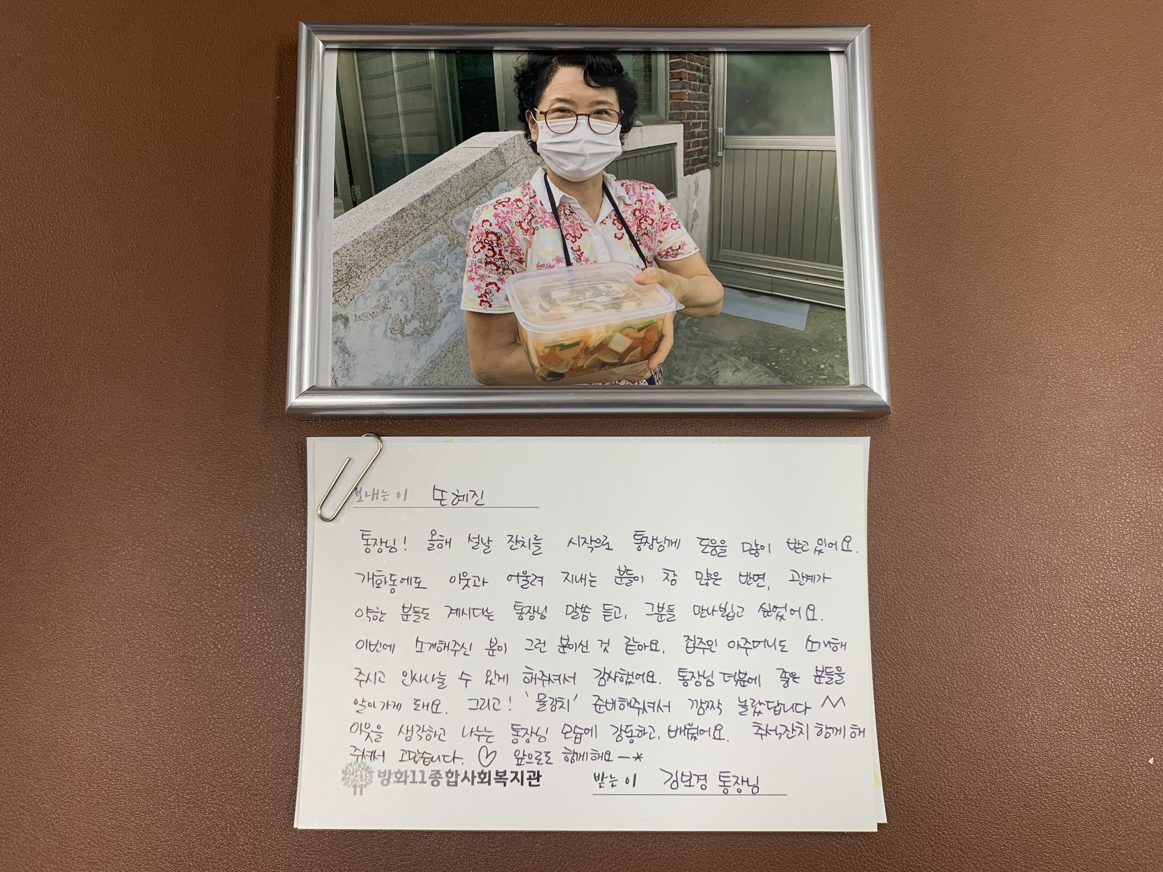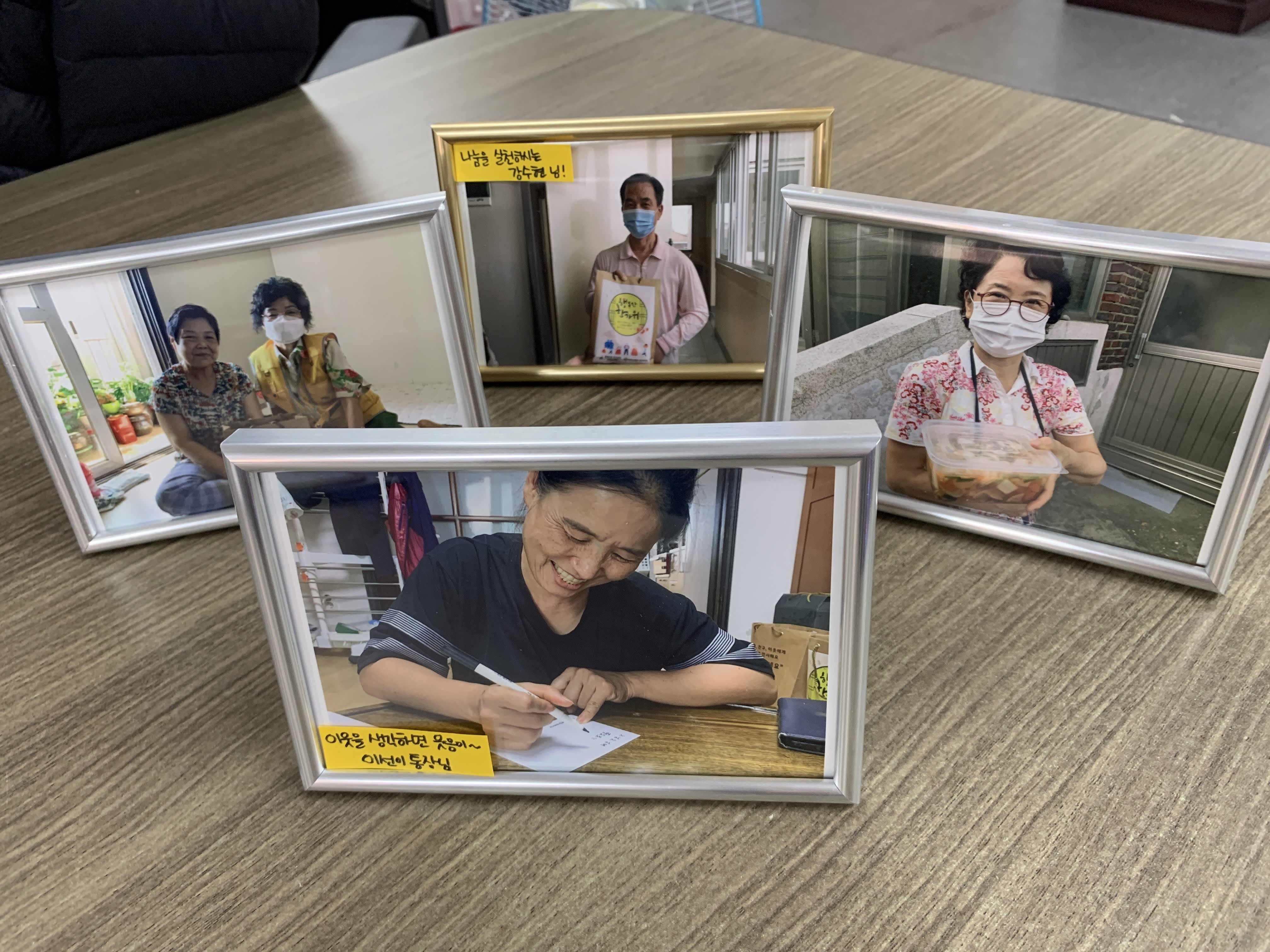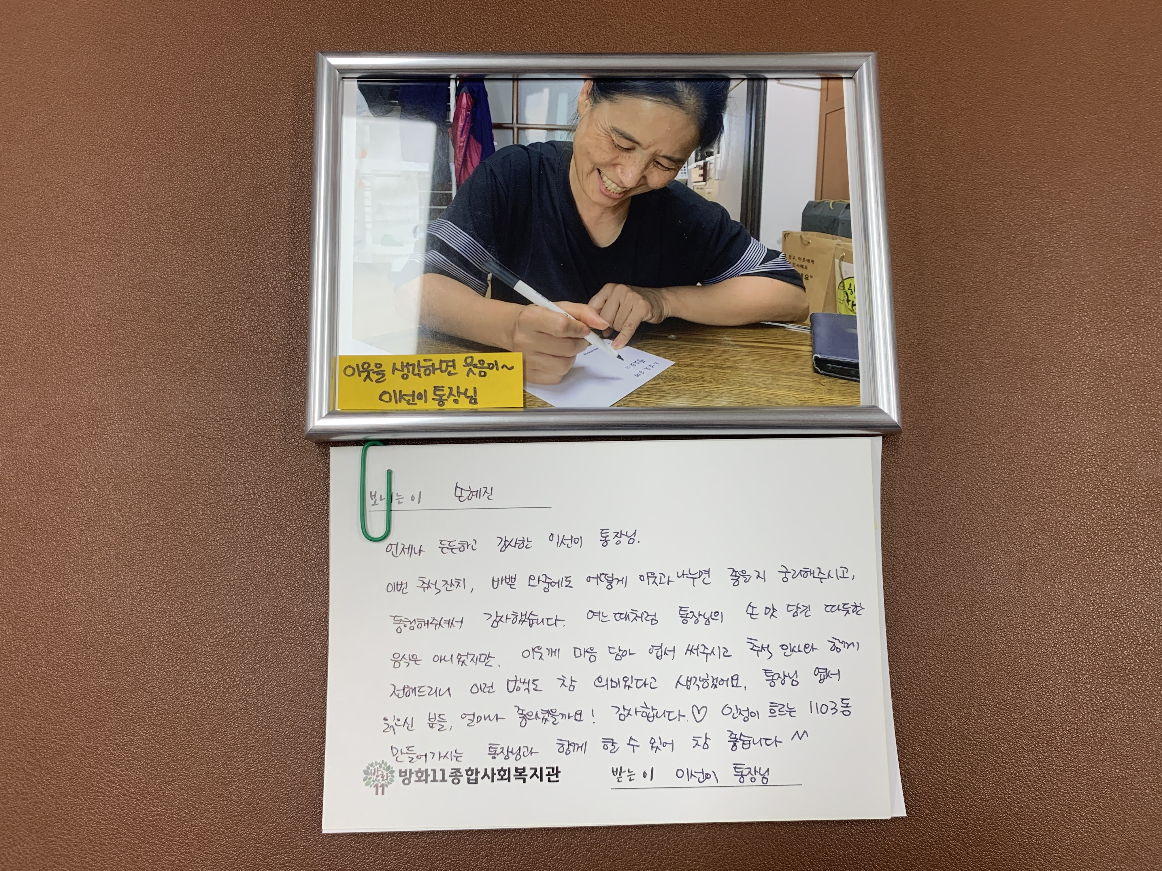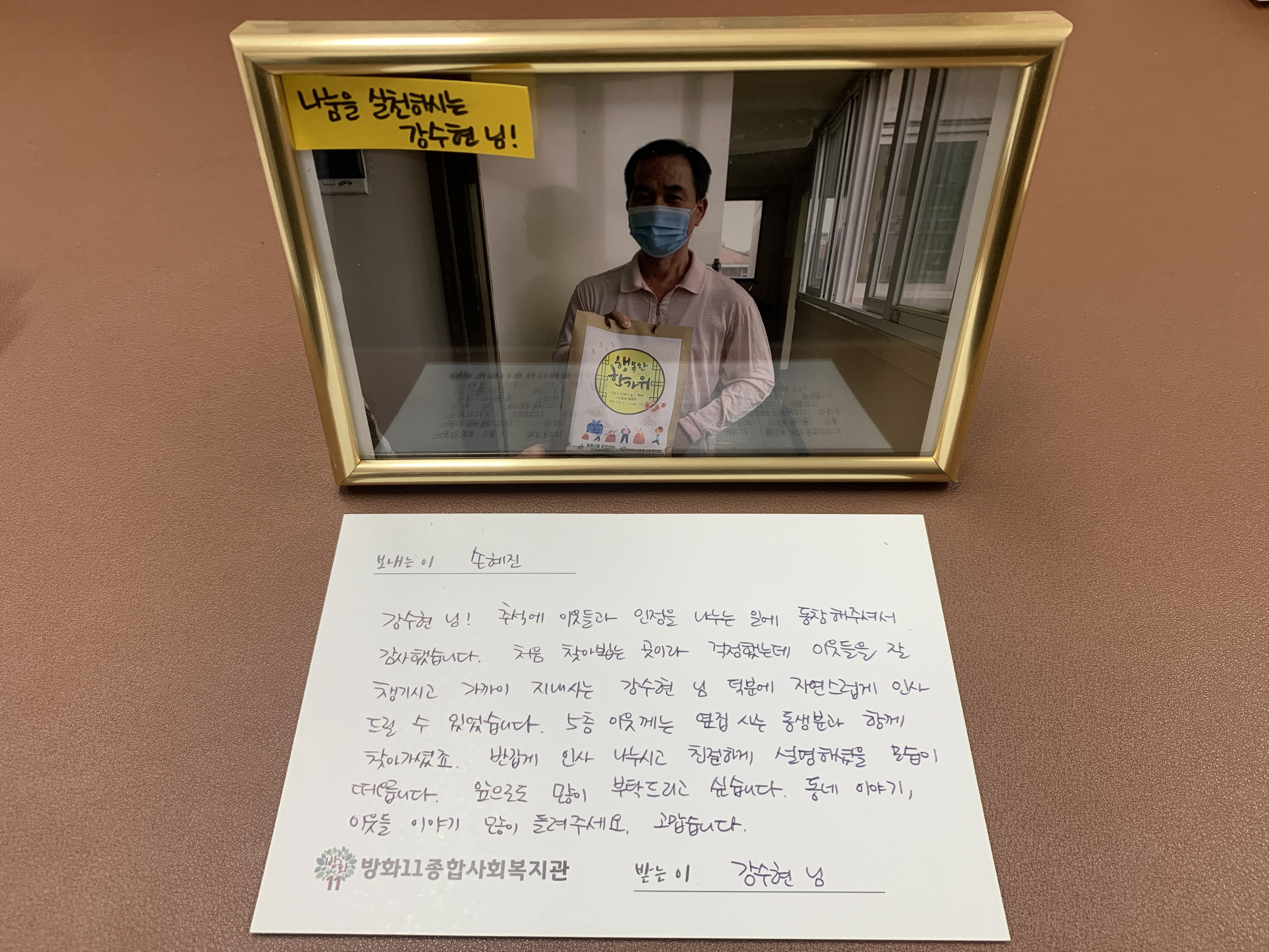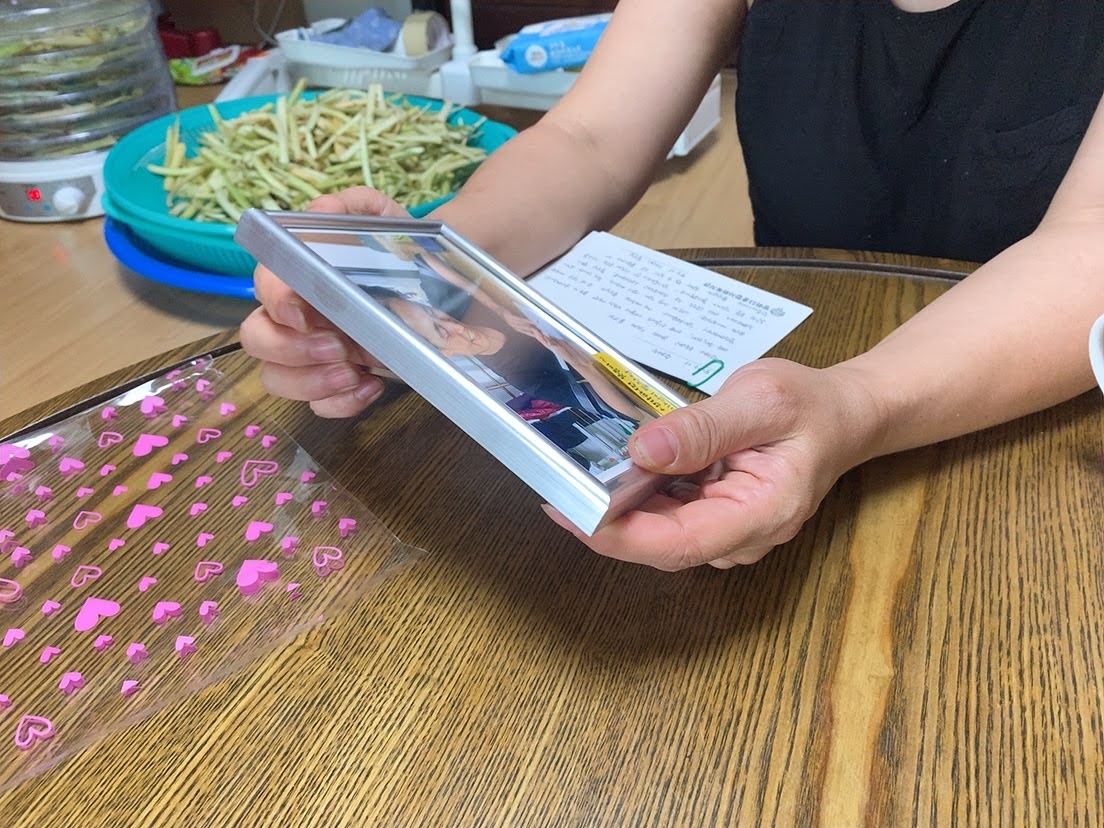 엽서를 쓰고 잔치 때 찍은 사진을 인화해 액자에 담아 선물했습니다.