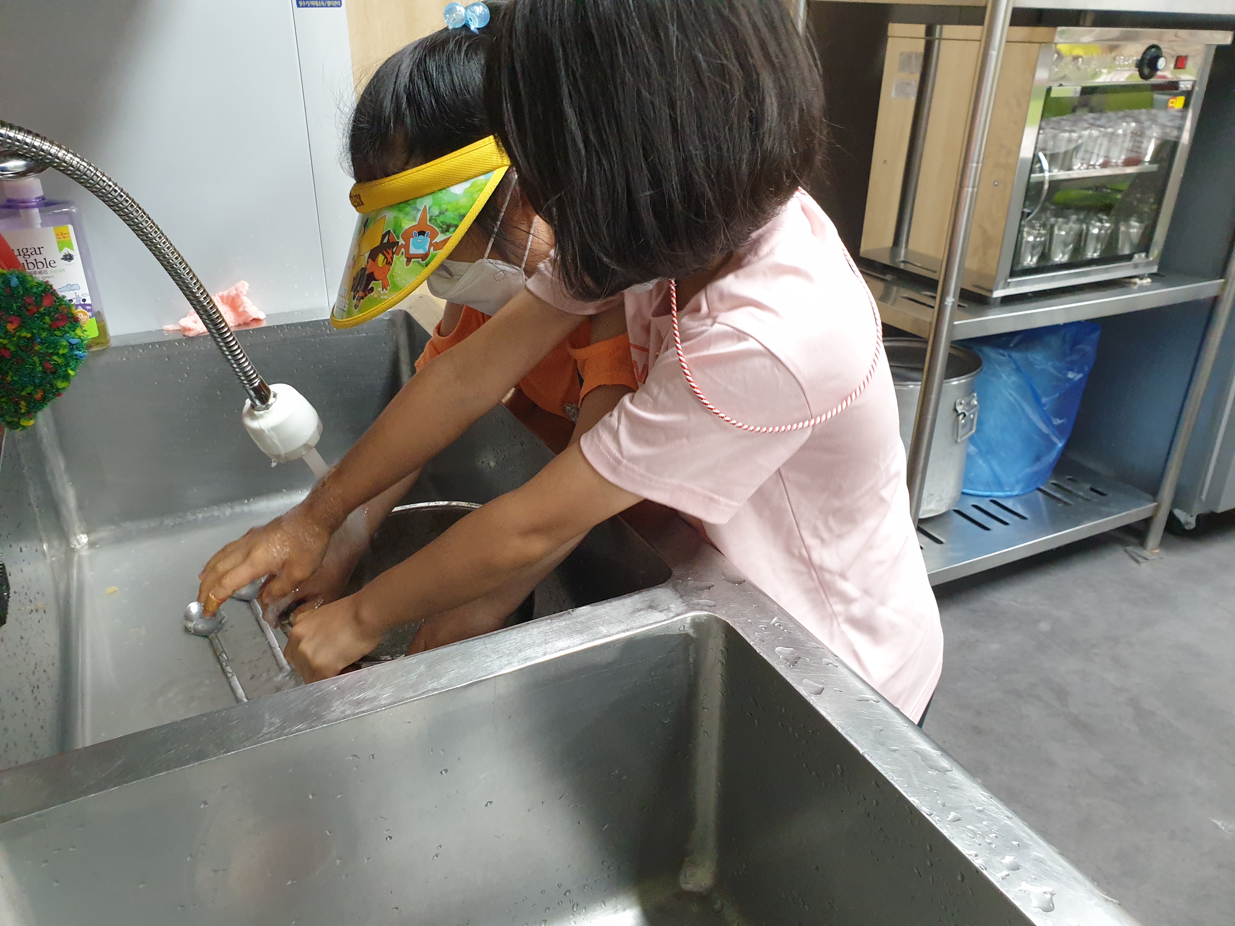 요리 활동이 끝나고 아이들이 직접 뒷정리를 합니다. 설거지 담당과 치우기 담당으로 역할을 분담합니다. 역할들은 모두 아이들이 이야기하고 정했습니다. 원하는 역할이 겹칠 땐 가위바위보로 정하자며 아이들이 의견을 직접 조율해나갑니다. 가르쳐주지 않아도 스스로 설거지와 청소를 진행합니다.